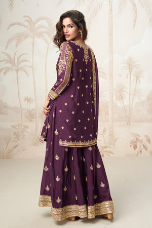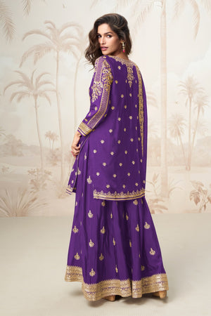 Sharara: The Free Size Sharara in matching Premium Fiber Chinon mirrors the top with digital print and embroidery on both front & back, creating a rich and coordinated look.