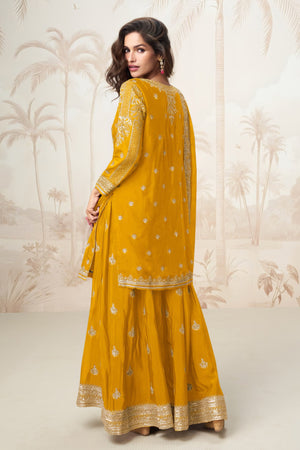 Drape yourself in festive finesse with this finely detailed Chinon sharara set, combining digital artistry with exquisite hand embroidery and statement accents.