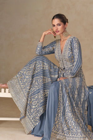 This freesize readymade set is designed in the finest quality Chinnon fabric, offering a luxurious drape and shine. The top features intricate dabka dori, sequence, and delicate handwork embroidery, while the matching plazo carries detailed handwork for a graceful finish. The dupatta is crafted from premium Chinnon, highlighted with an elegant four-side embroidered lace, completing the regal look.