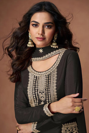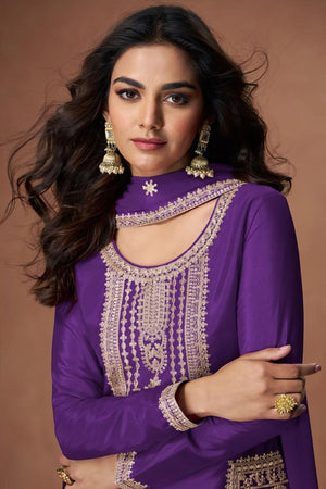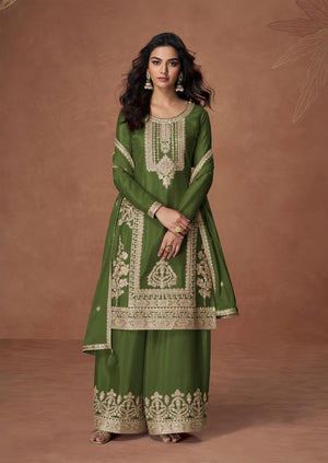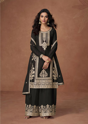 Grace meets grandeur in this beautifully designed Sharara suit, crafted entirely from luxurious premium Chinon silk. The top features a rich, flowing silhouette that drapes effortlessly, offering a soft sheen and elegant fall. Paired with a wide-flared sharara bottom made from the same premium fabric, it brings comfort, volume, and festive flair to your look. The matching Chinon dupatta adds a final layer of elegance, making this ensemble ideal for weddings, festive gatherings, and traditional celebrations. Subtle yet striking, this outfit blends modern sophistication with timeless ethnic charm.