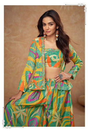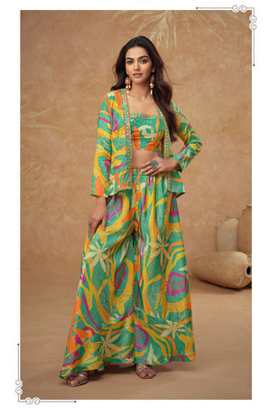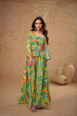 Unveil effortless elegance with this beautifully crafted Sharara suit, made from premium Real Chinon and Silk with striking digital print work. The top is designed to offer a soft, fluid drape with a rich, lustrous texture that enhances the overall silhouette. It is paired with a flared plazoo (Sharara) bottom in the same luxurious fabric and print, adding volume and a festive vibe to your look. The vibrant digital prints bring a contemporary twist to a traditional design—perfect for festive events, cultural functions, and daytime celebrations.