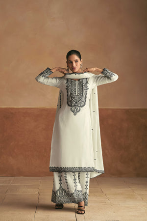 This beautifully stitched set is made entirely from Real Chinon fabric, known for its soft sheen and luxurious fall. The top features a smooth and flowy finish, paired with a coordinated bottom in the same elegant fabric. The Real Chinon dupatta completes the outfit with a light, graceful touch – perfect for special occasions.