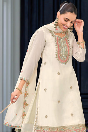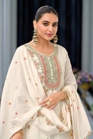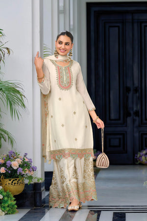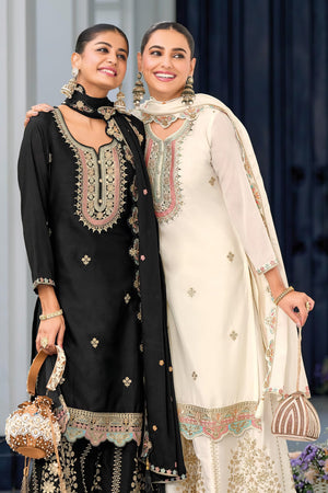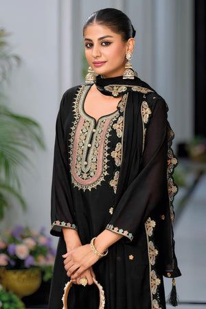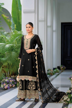 This luxurious full stitched plazzo suit is crafted from premium Heavy Chinon fabric. The top features elegant embroidery that adds a sophisticated look, while the plazzo bottom is richly embroidered on both the front and back, giving it a true designer appeal. The matching dupatta, also in Heavy Chinon with detailed embroidery, completes this graceful ensemble, ideal for festive and formal occasions.