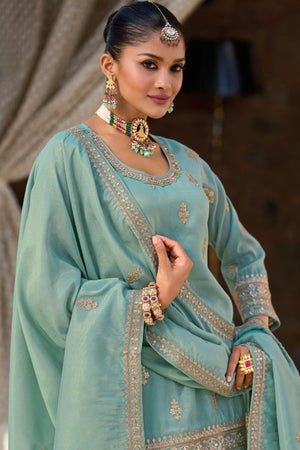 This full stitched plazzo set is crafted from soft Simar fabric and adorned with elegant embroidery throughout. The top features a graceful silhouette, perfectly paired with a wide-legged embroidered plazzo bottom. A matching Simar dupatta with intricate embroidery completes the set, making it a sophisticated choice for festive and traditional occasions.