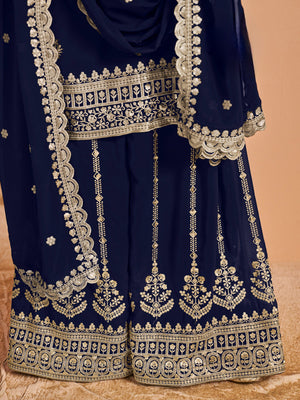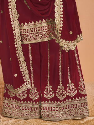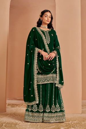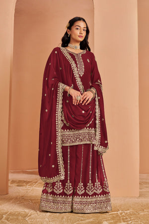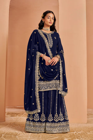 This full stitched plazzo suit is crafted from lightweight and flowy Faux Georgette fabric, offering a graceful drape and modern look. The outfit includes a coordinated plazzo bottom and matching dupatta in the same fabric. The comfortable Santoon inner ensures easy wear, making it ideal for long festive days and elegant gatherings.