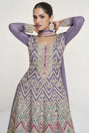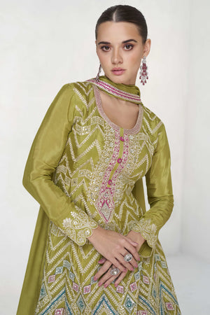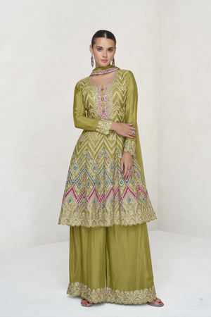 Crafted in luxurious premium Chinon silk, this elegant set features a coordinated top and plazzo that offer both comfort and sophistication. The matching dupatta in the same fabric adds fluidity and charm, making it a versatile pick for festive and semi-formal occasions.