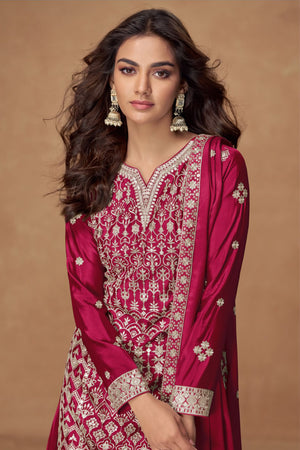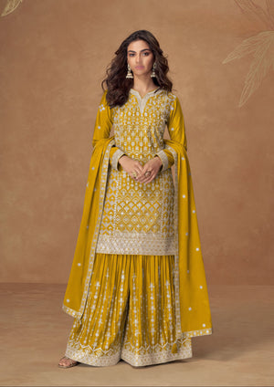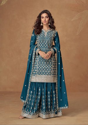 This designer sharara set is tailored from luxurious premium chinnon silk, offering a smooth texture and rich sheen. The top, crafted in fine chinnon silk, exudes timeless elegance, while the flowing sharara bottom adds volume and a statement appeal. Completing the ensemble is a matching chinnon silk dupatta that enhances the outfit’s refined charm. Designed with finesse, this sharara set is the perfect blend of sophistication and tradition, making it an ideal choice for grand occasions.Occasion