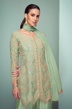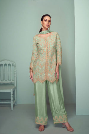 Plazzo: The co-ordinated Organza Simar Silk plazzo pairs effortlessly with the top, enhancing the ensemble's flowy, ethereal appeal.