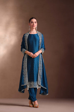Drape yourself in luxury with this radiant two-tone georgette suit, embellished with intricate embroidery and sparkling Swarovski highlights — designed to make you shine.