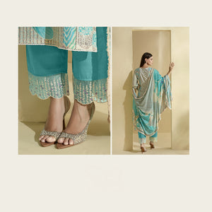 Bottom: The Pure Cotton bottom is finished with a graceful scalloped Resham Embroidered Organza border at the hemline, offering a cohesive and polished look.