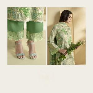 Top: Made from Pure Cotton Lawn, the top is beautifully enhanced with digital prints, intricate embroidery patch placements, and features a Scalloped Resham Embroidered Organza border on the sleeves — adding a touch of sophistication to every detail.