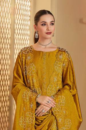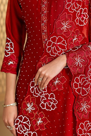 Top: Two-tone Catonic Georgette featuring heavy embroidery and glimmering Swarovski work, creating a regal and luxurious look. - Bottom & Inner: Crafted from soft Santoon for unmatched comfort and a smooth silhouette.