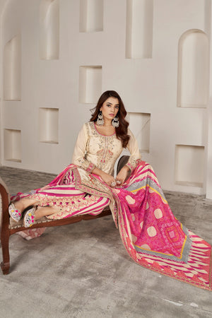 - Dupatta: Premium chinon dupatta with fine digital print and a four-side handwork border that adds elegance to the ensemble.