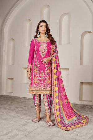 • Dupatta: Premium chinon with fine digital print and a handcrafted four-side handwork border for a regal finish.