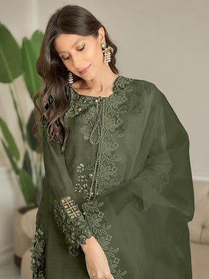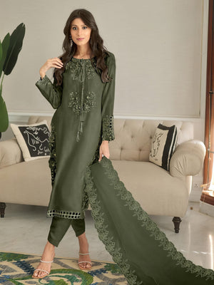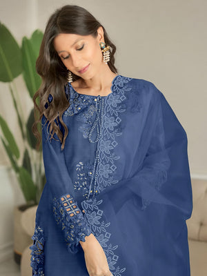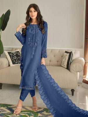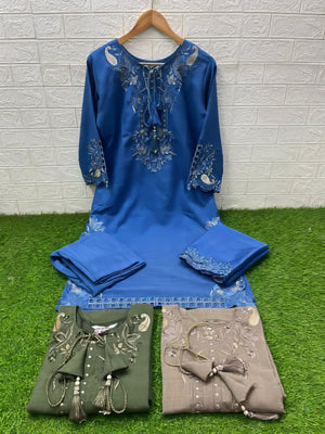 This designer tunic set showcases a stylish silhouette with classic embroidery and elegant cutwork on the top. The tunic features beautifully embroidered sleeves for a glam finish. Paired with a matching pant in BSY fancy slub fabric and complemented by a heavily embroidered organza dupatta, this outfit blends contemporary flair with traditional charm.