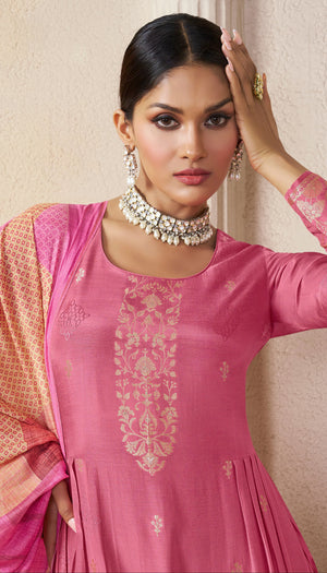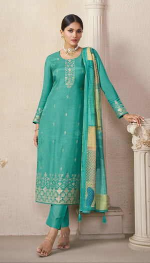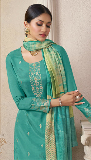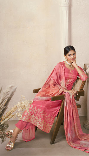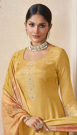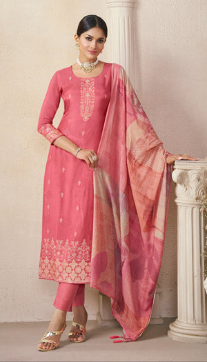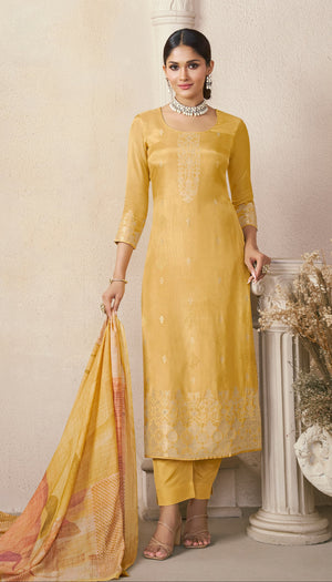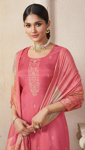 This fully stitched suit set exudes elegance with its self-weaved viscose muslin jacquard top, offering a rich texture and graceful finish. The ensemble is paired with a soft and breathable santoon bottom that ensures day-long comfort. Completing the look is a digitally printed viscose muslin dupatta that adds a vibrant contrast and contemporary flair. A perfect blend of tradition and modern style for graceful everyday wear or light festive occasions.