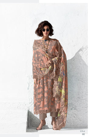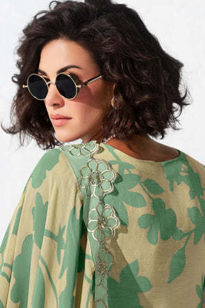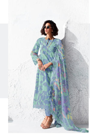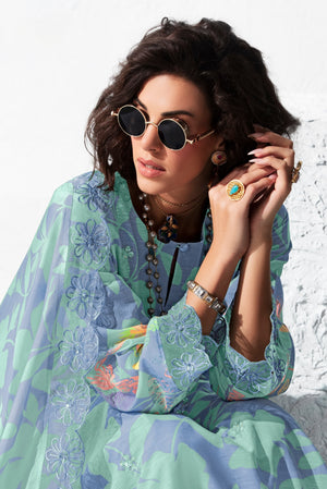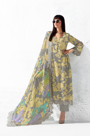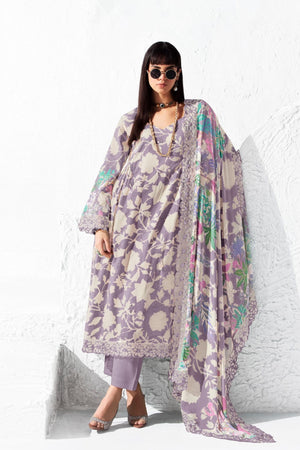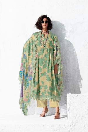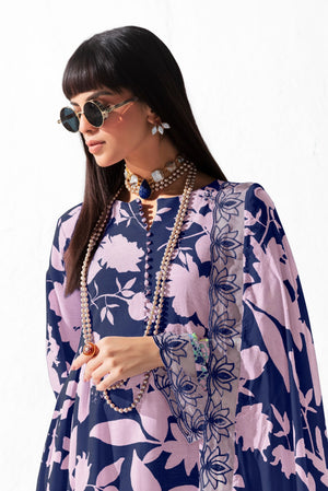 This graceful three-piece set is crafted in pure muslin, featuring digital prints and delicately embroidered buttis on the front of the top. The hemline and sleeves are enhanced with elegant scalloped floral embroidery borders for a refined and luxurious look. It is paired with a heavy pure muslin bottom that adds structure and flow. Completing the ensemble is a pure chinon dupatta, digitally printed and finished with four-side scalloped floral embroidered borders—perfect for elevating your festive and daytime looks.