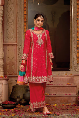 This stylish set features a beautifully embroidered Chinon top, paired with a matching plazo that adds comfort with elegance. The Chinon dupatta showcases a graceful digital print, enhanced with fine embroidery work—perfect for creating a sophisticated yet festive look.