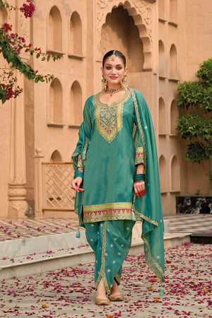 This graceful set features a finely embroidered Simar fabric top paired with a stylish Simar dhoti, both offering a perfect blend of comfort and elegance. The matching Simar dupatta, detailed with delicate embroidery, adds a refined touch to the overall look—ideal for festive and traditional occasions.