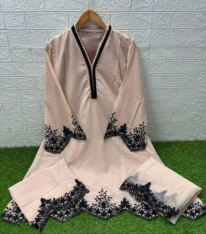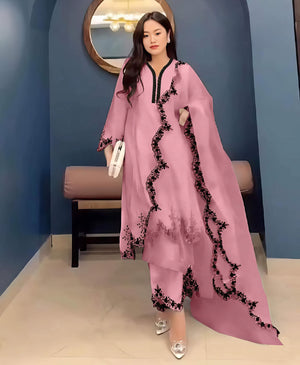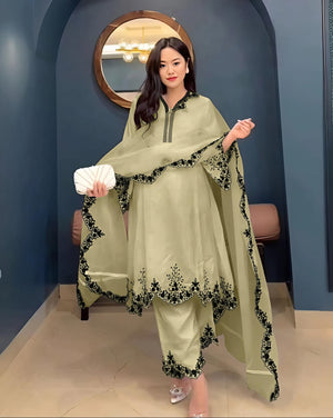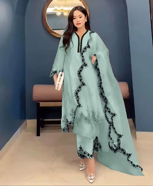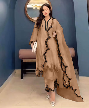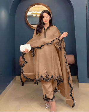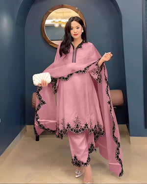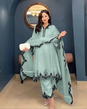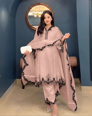 This designer tunic set features classic heavy cutwork embroidery on both the front and back, enhanced with a stylish neckline. The frock-style kurti is paired with beautifully embroidered cutwork sleeves and a matching organza dupatta. The set is completed with embroidered cutwork plazo pants, creating a graceful and trendy ensemble perfect for any elegant affair.