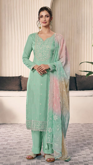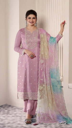 An ethnic ensemble that blends tradition with elegance, featuring rich Moonga silk and beautifully embroidered chiffon for a timeless festive look.