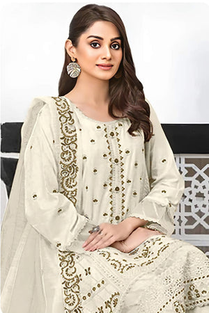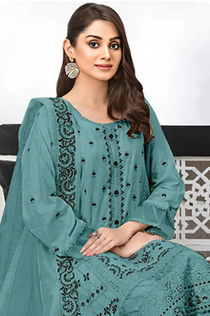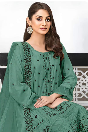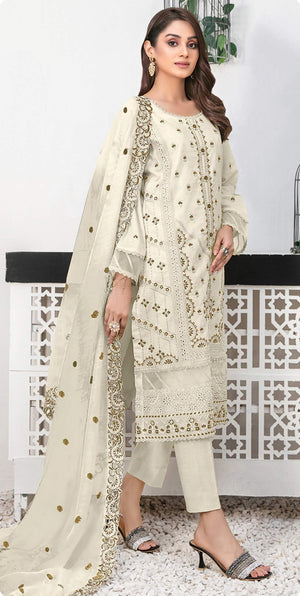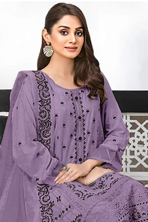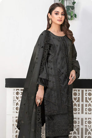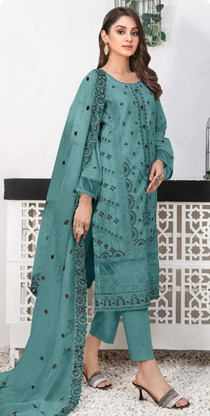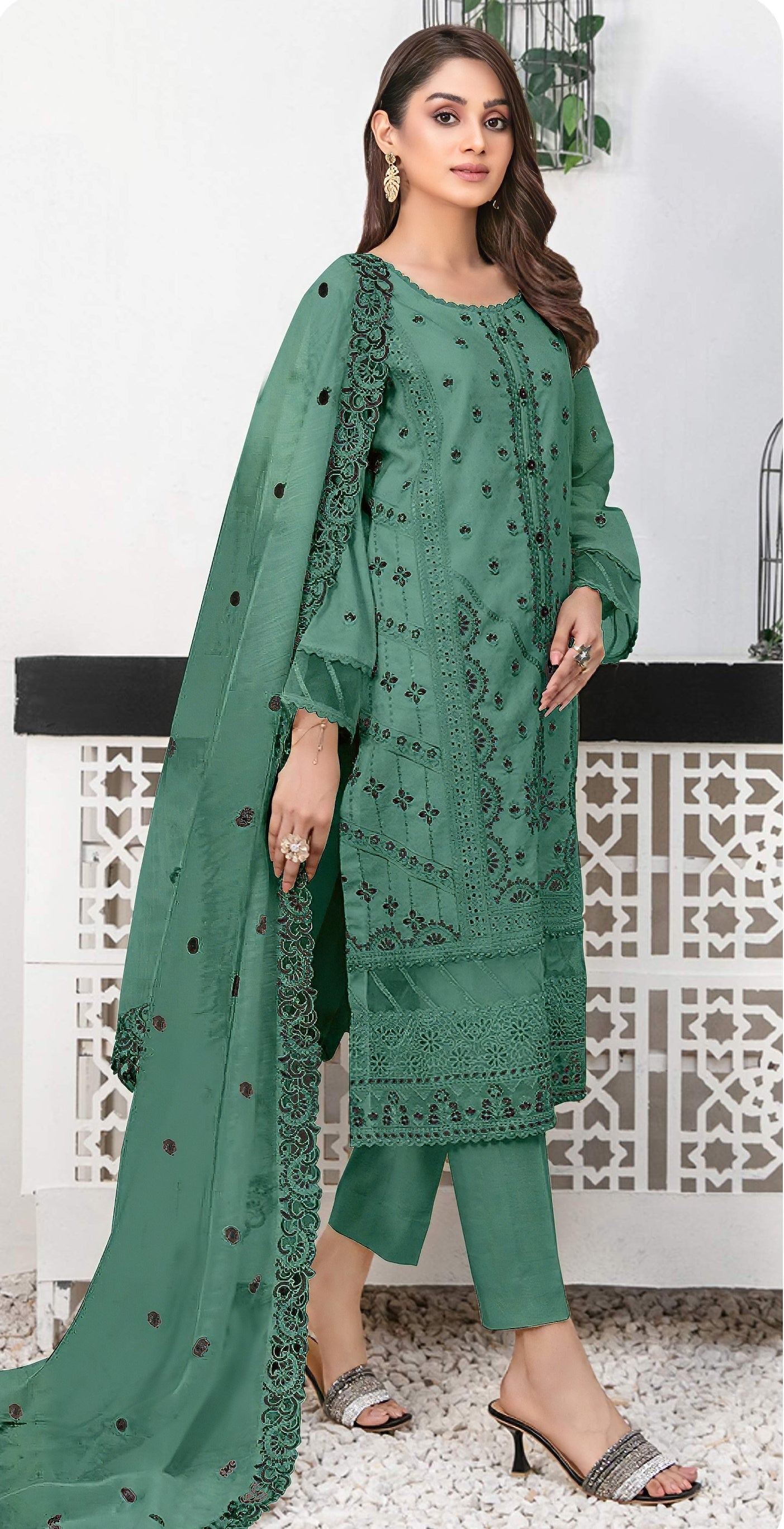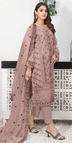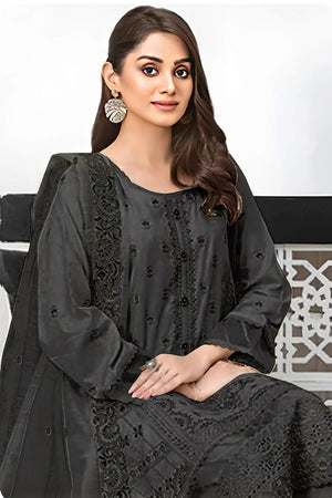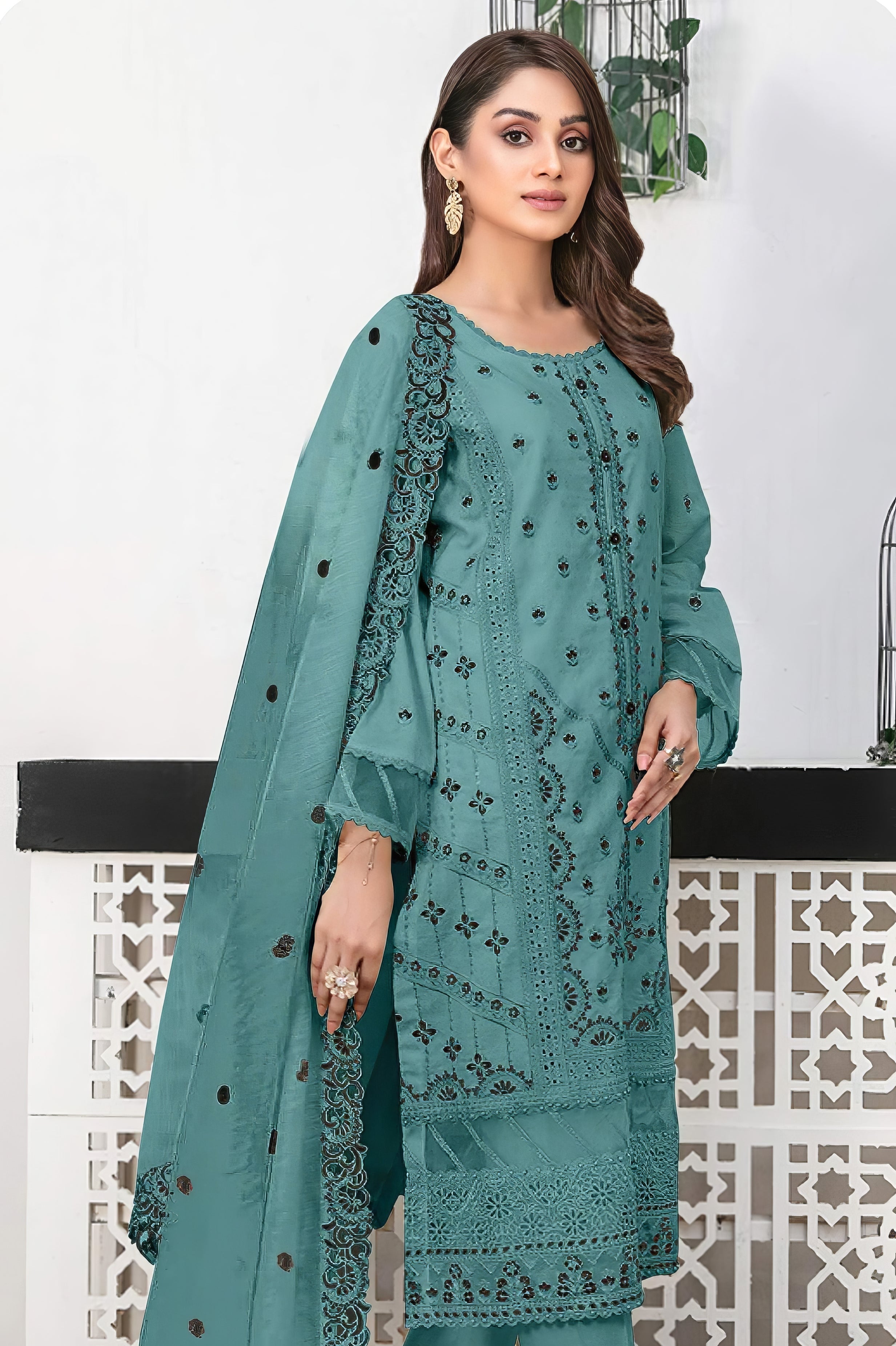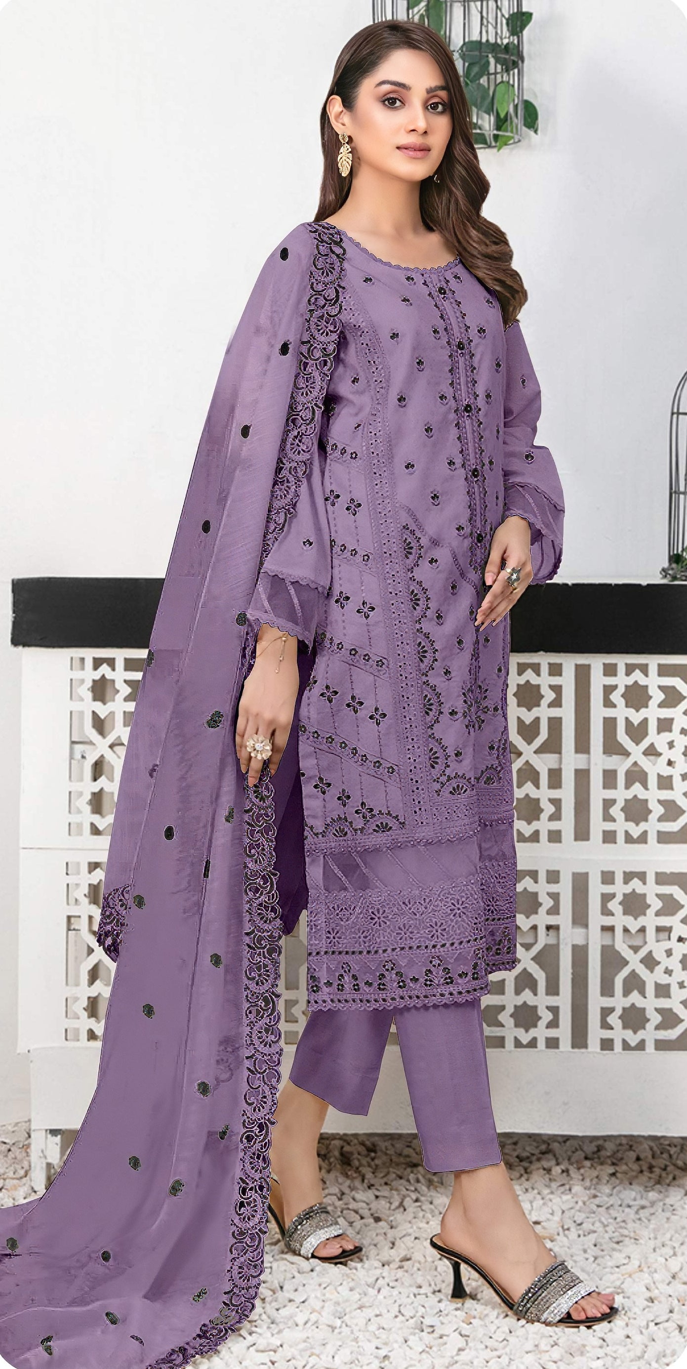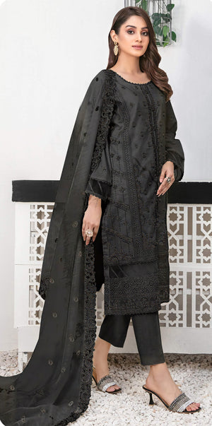 This elegant readymade ensemble features a beautifully embroidered georgette top adorned with intricate sequins work. The sleeves and ghera lace are finished with fine tissue embroidery, adding a touch of regal charm. Paired with a heavy santoon trouser and an embroidered heavy fox dupatta, this outfit exudes sophistication and festive grace.