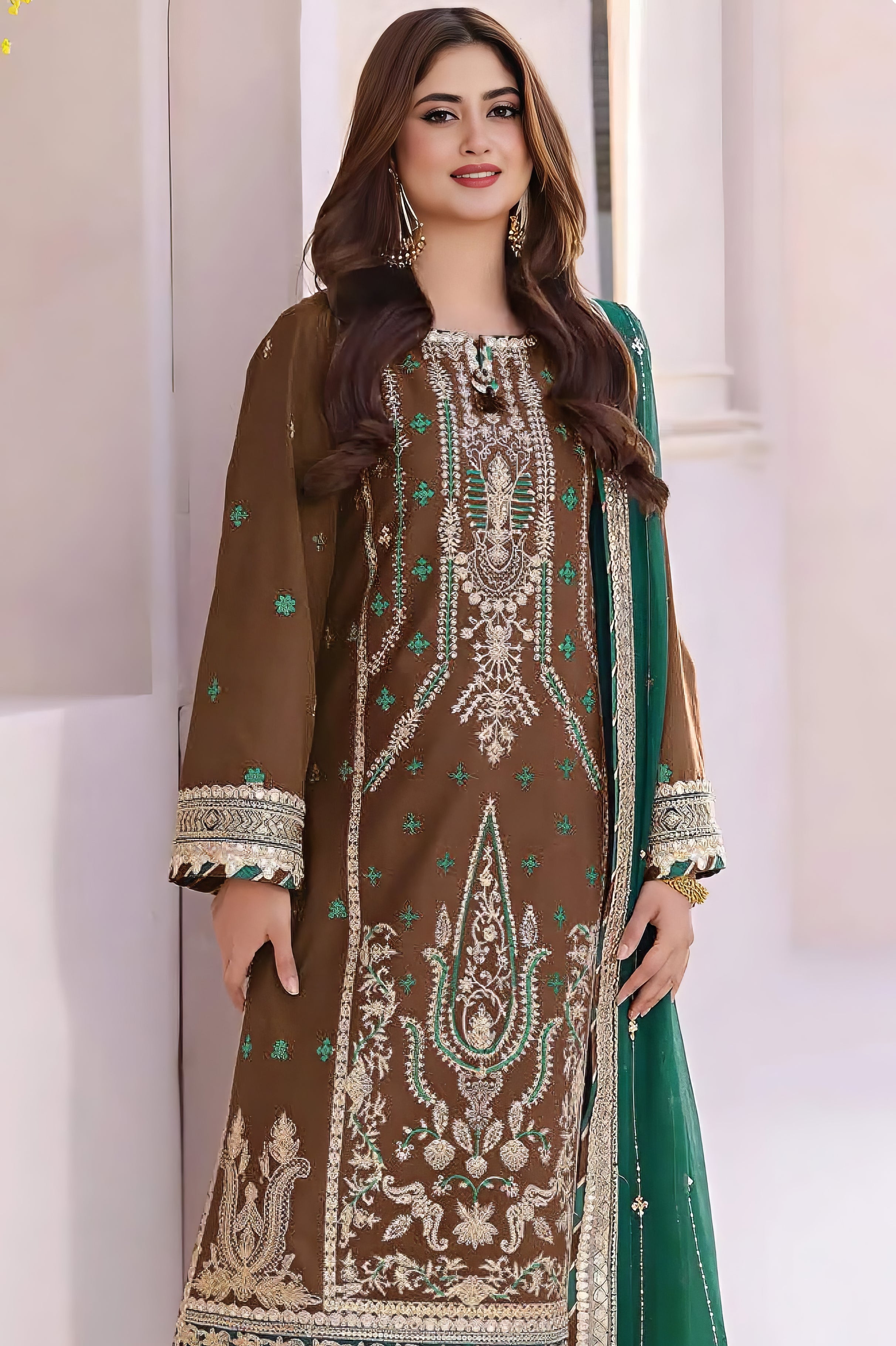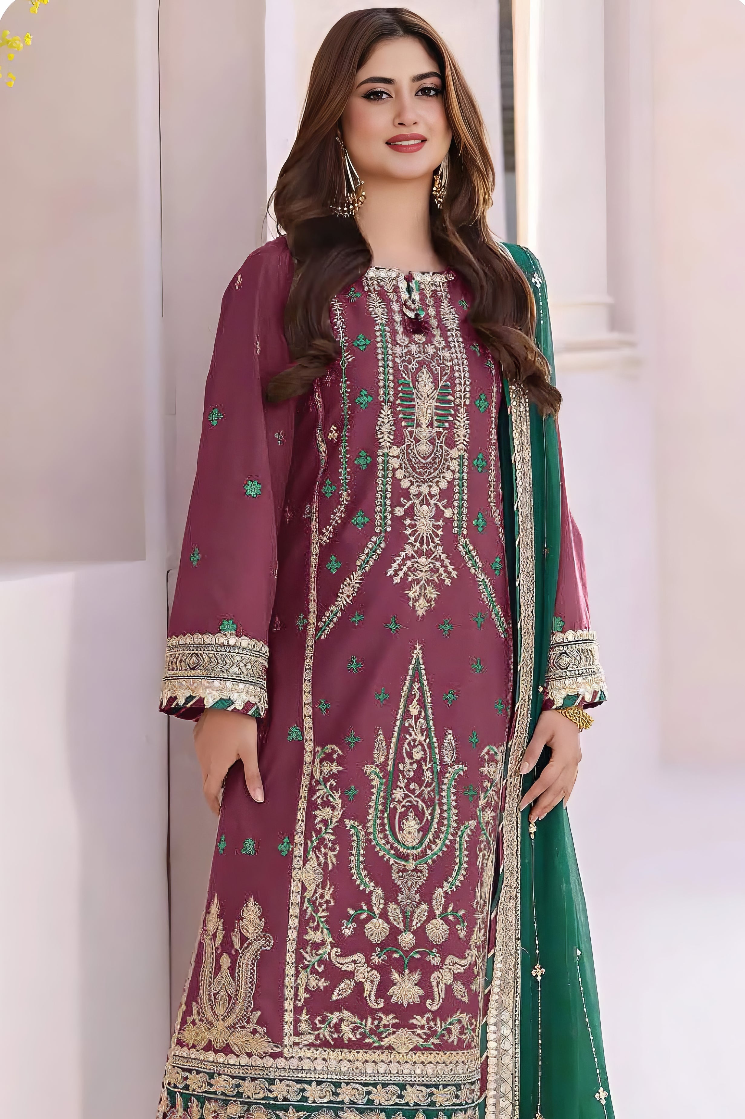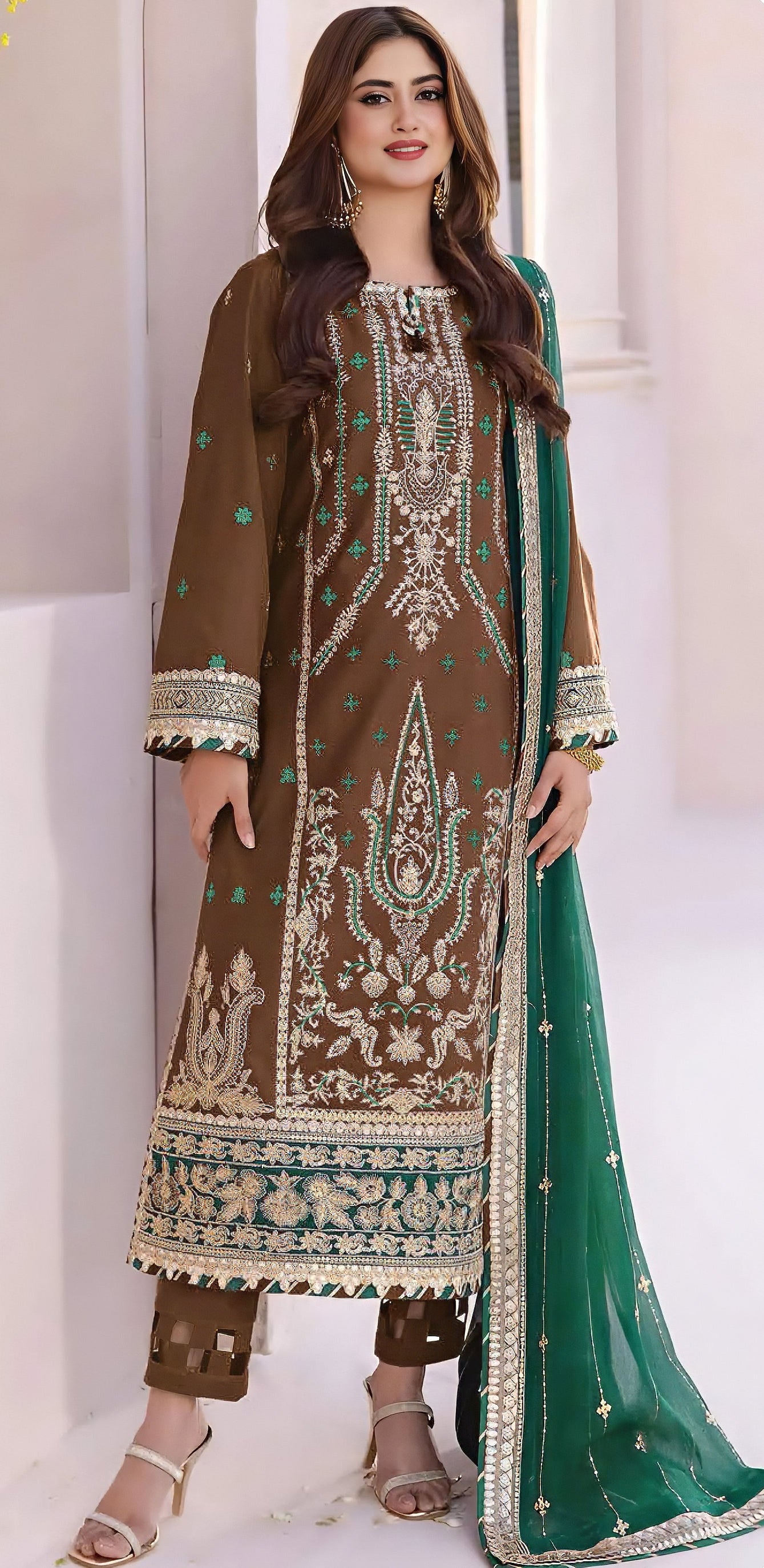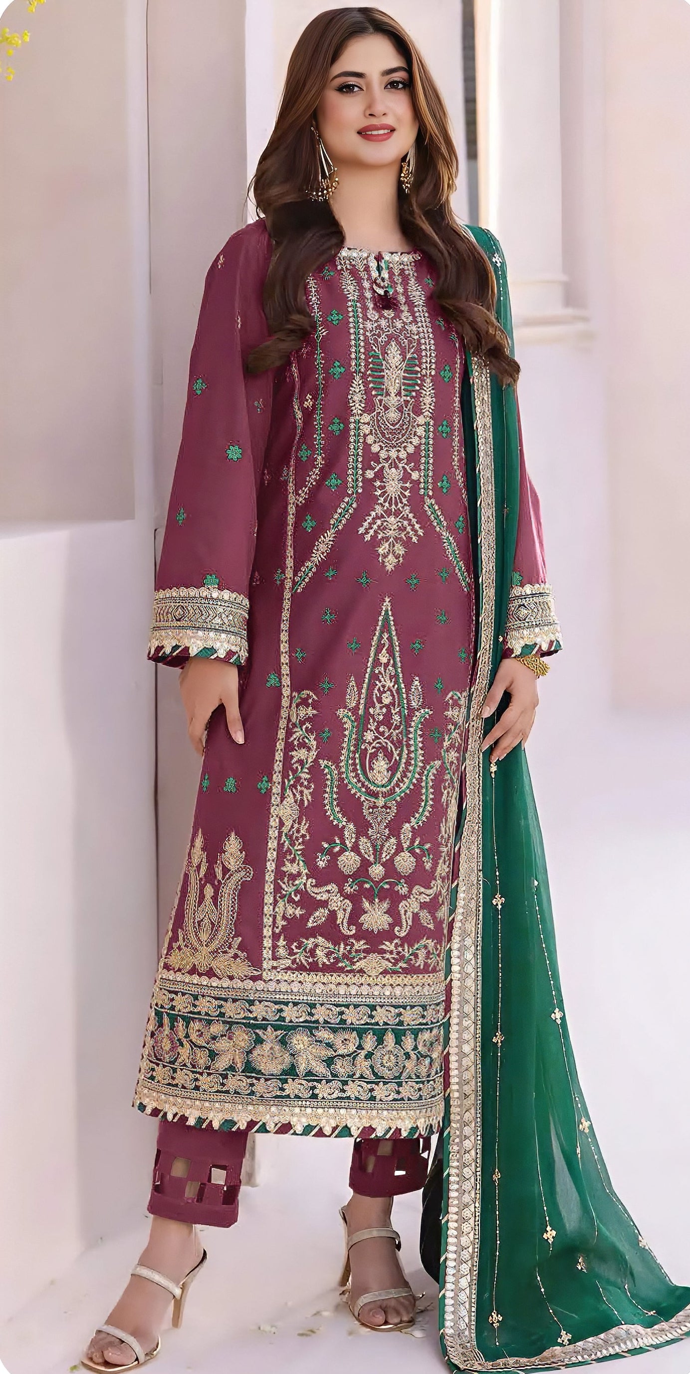 This elegant readymade outfit is beautifully tailored from heavy georgette fabric, enhanced with detailed embroidery and sparkling Jarkan work on both the top and sleeves. The dull santoon bottom offers comfort, while the embroidered heavy georgette dupatta completes the ensemble with a graceful touch. Perfect for festive and celebration wear.