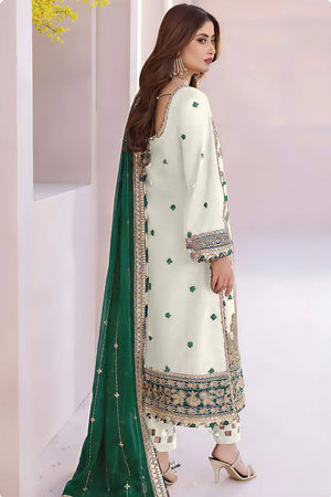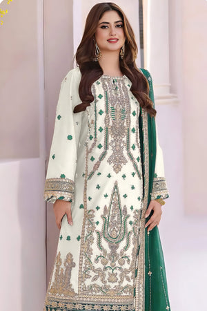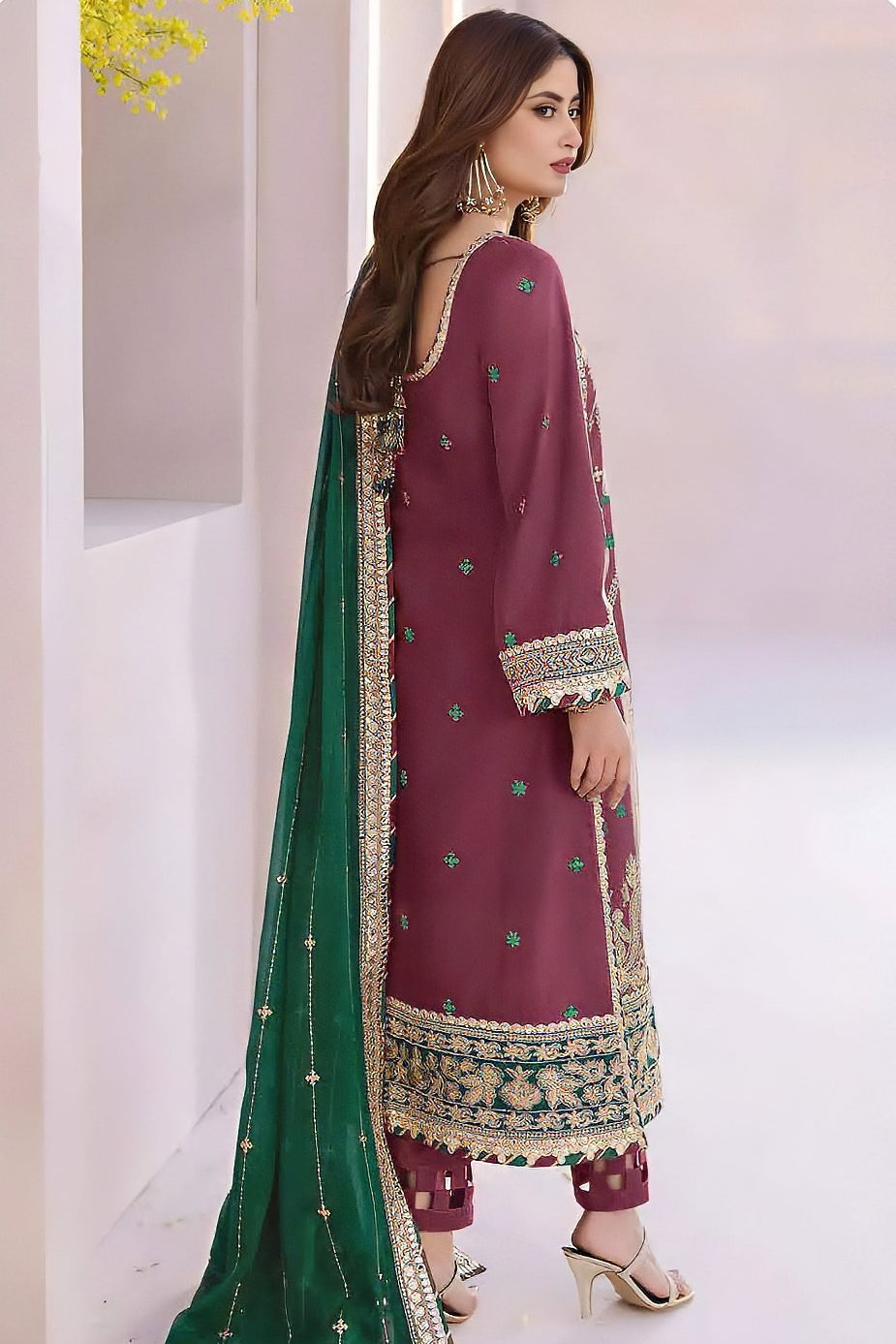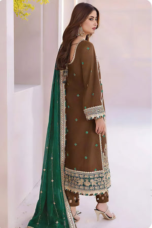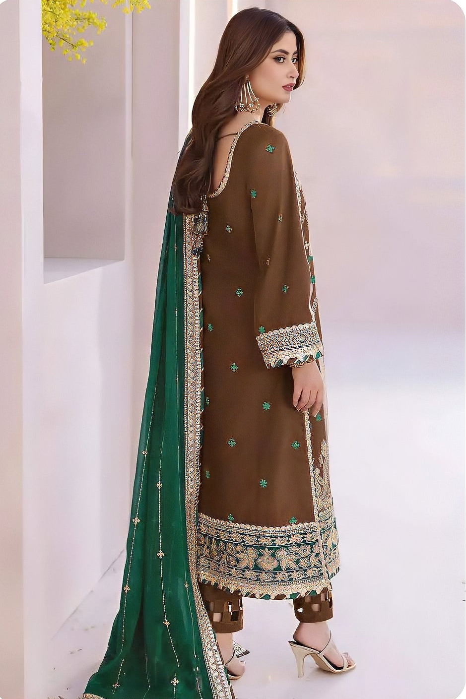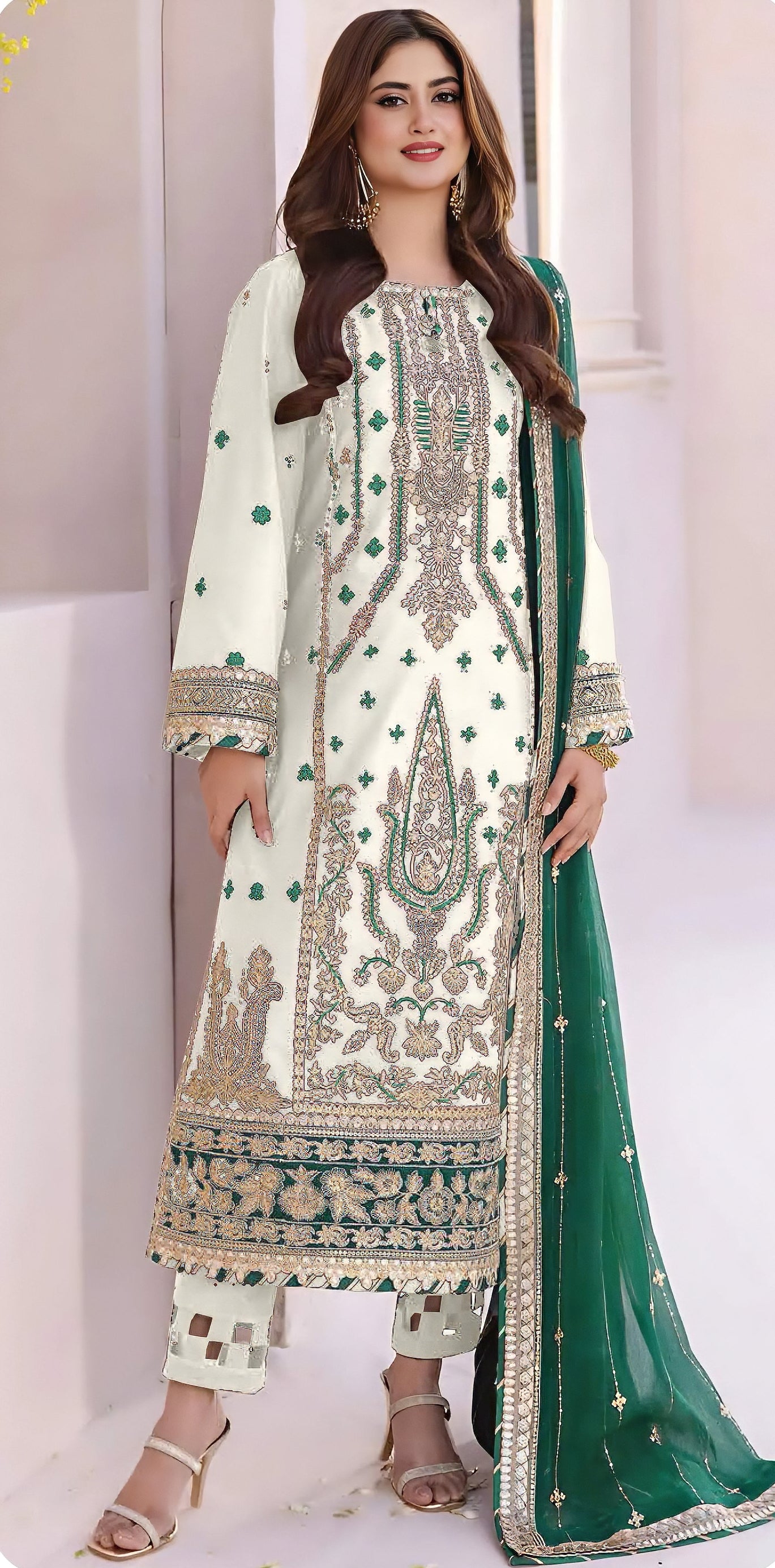 This elegant readymade outfit is beautifully tailored from heavy georgette fabric, enhanced with detailed embroidery and sparkling Jarkan work on both the top and sleeves. The dull santoon bottom offers comfort, while the embroidered heavy georgette dupatta completes the ensemble with a graceful touch. Perfect for festive and celebration wear.