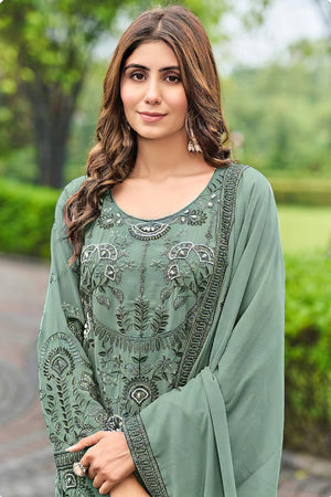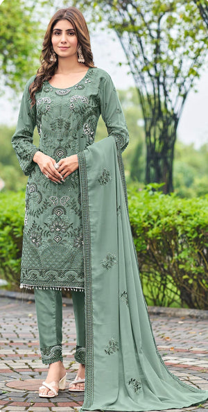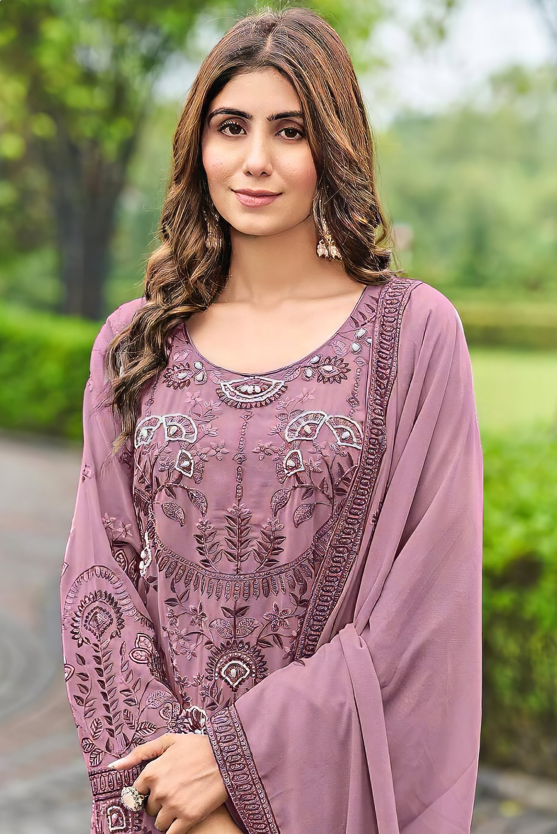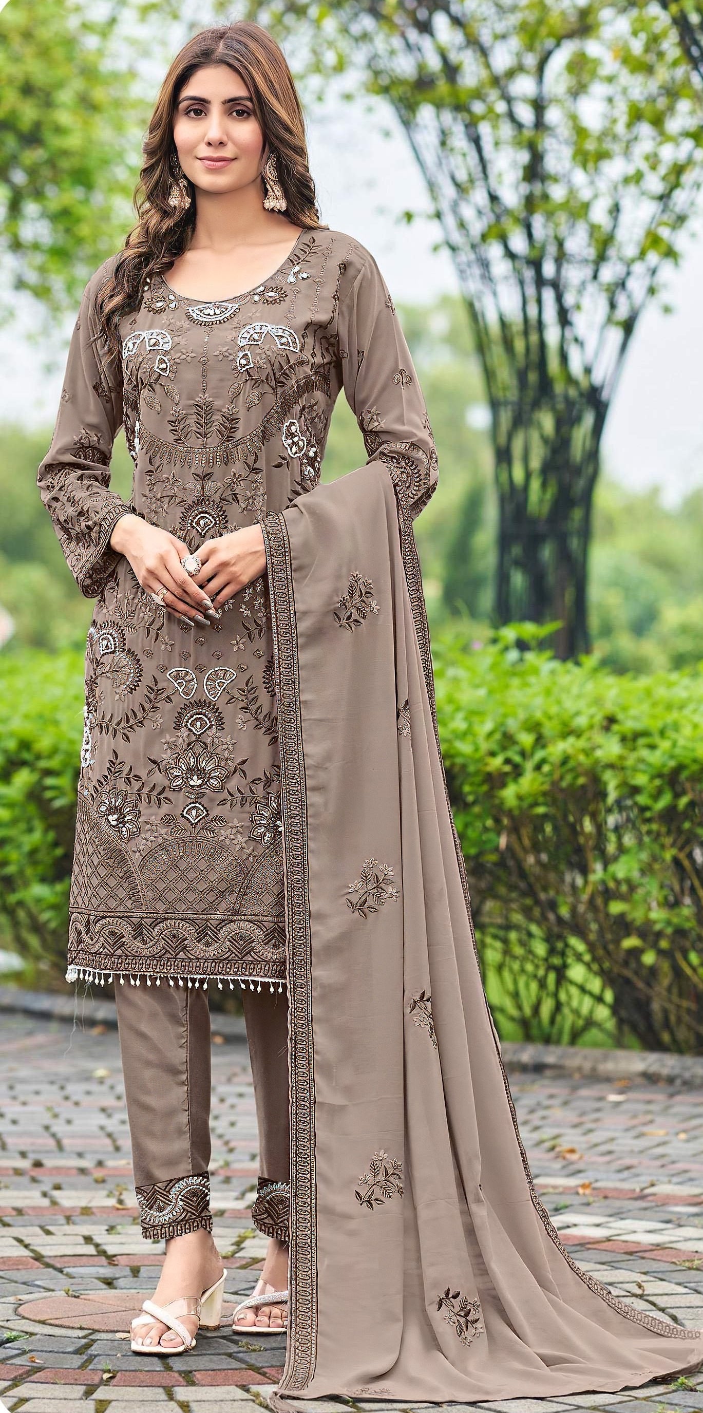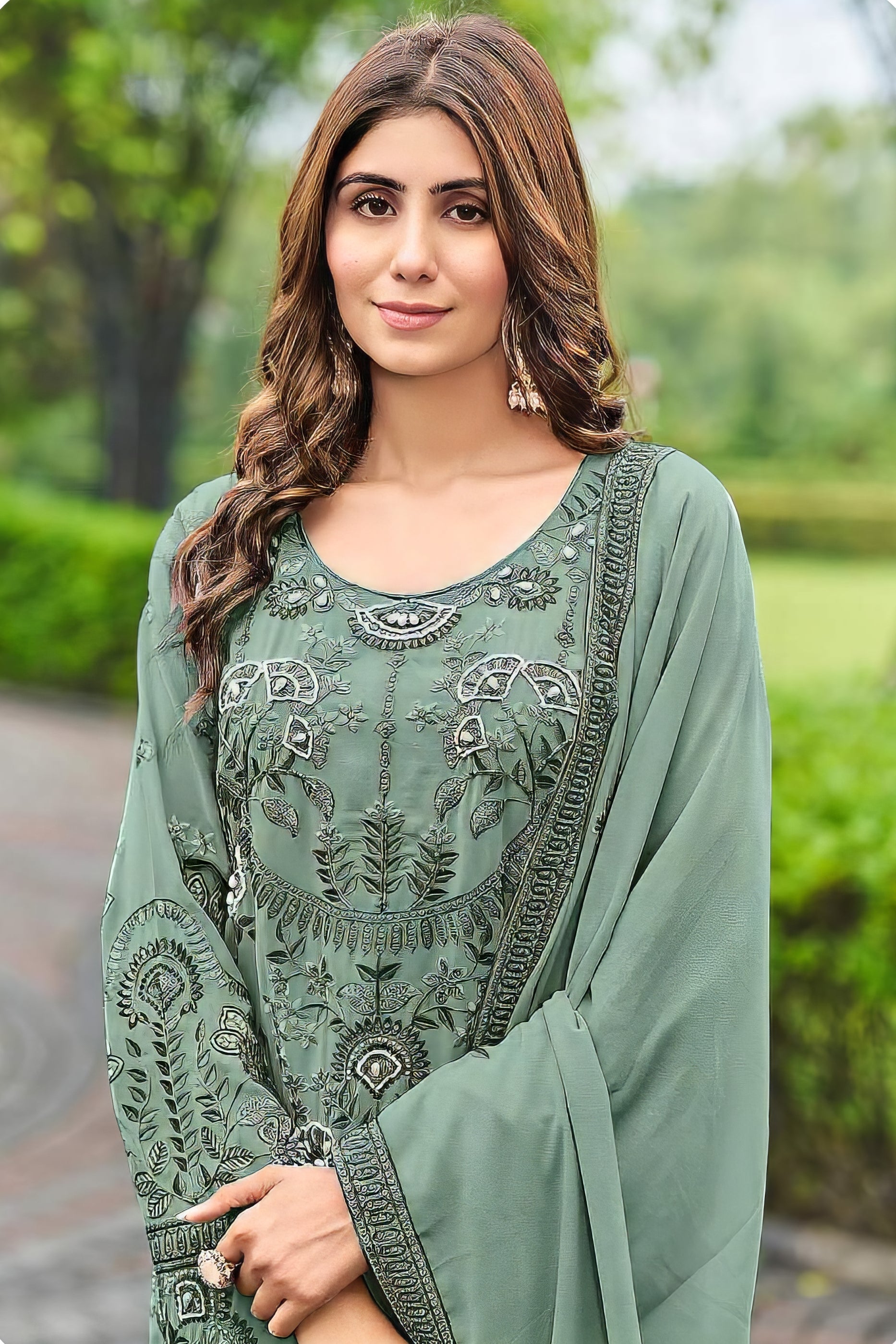This exquisite readymade outfit is crafted from premium heavy georgette fabric, featuring elegant embroidery and shimmering Jarkan work on the top and sleeves. The embroidered georgette dupatta adds a touch of sophistication, making it perfect for festive occasions and celebrations.