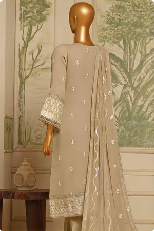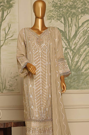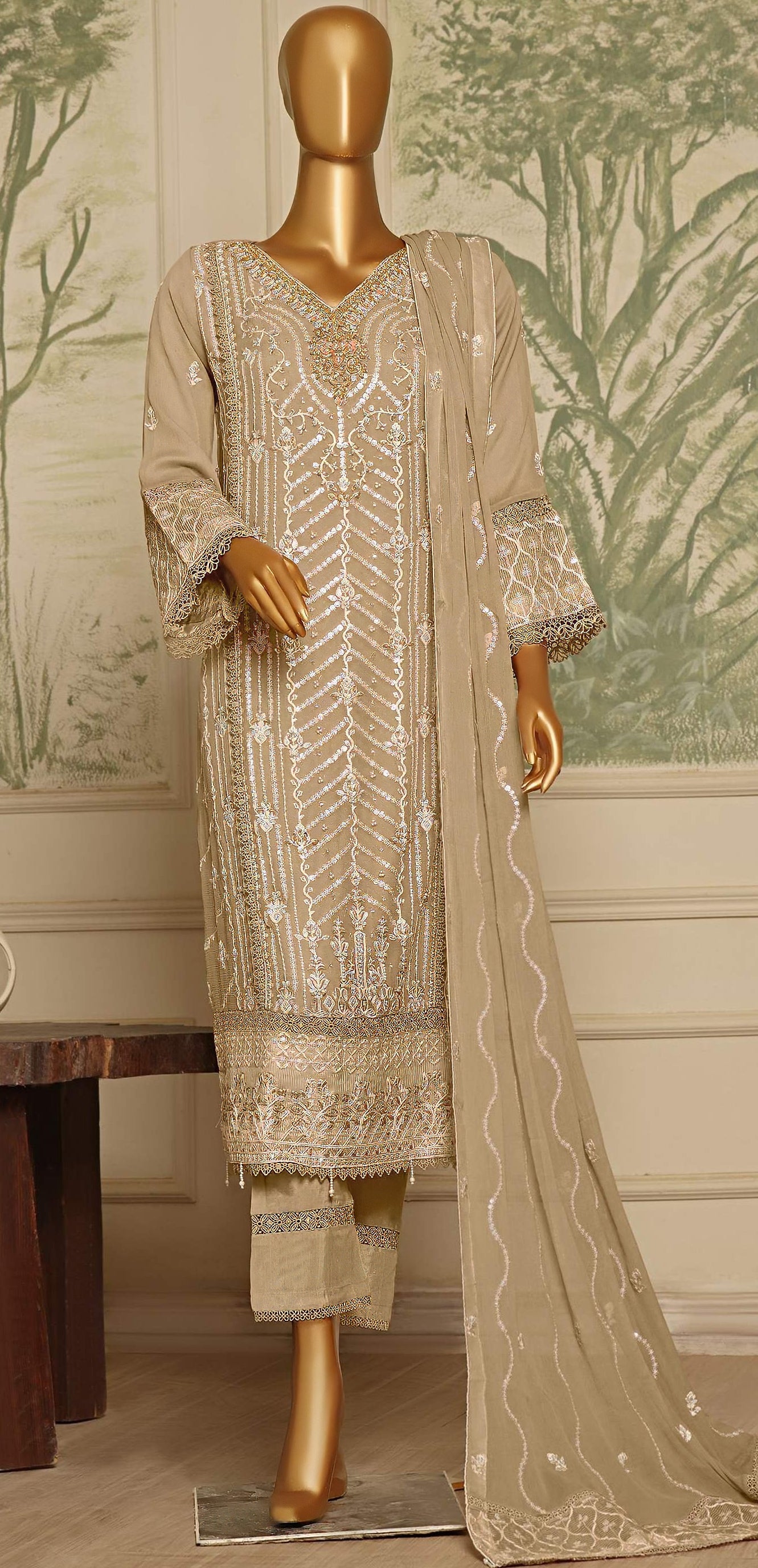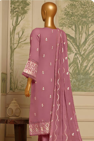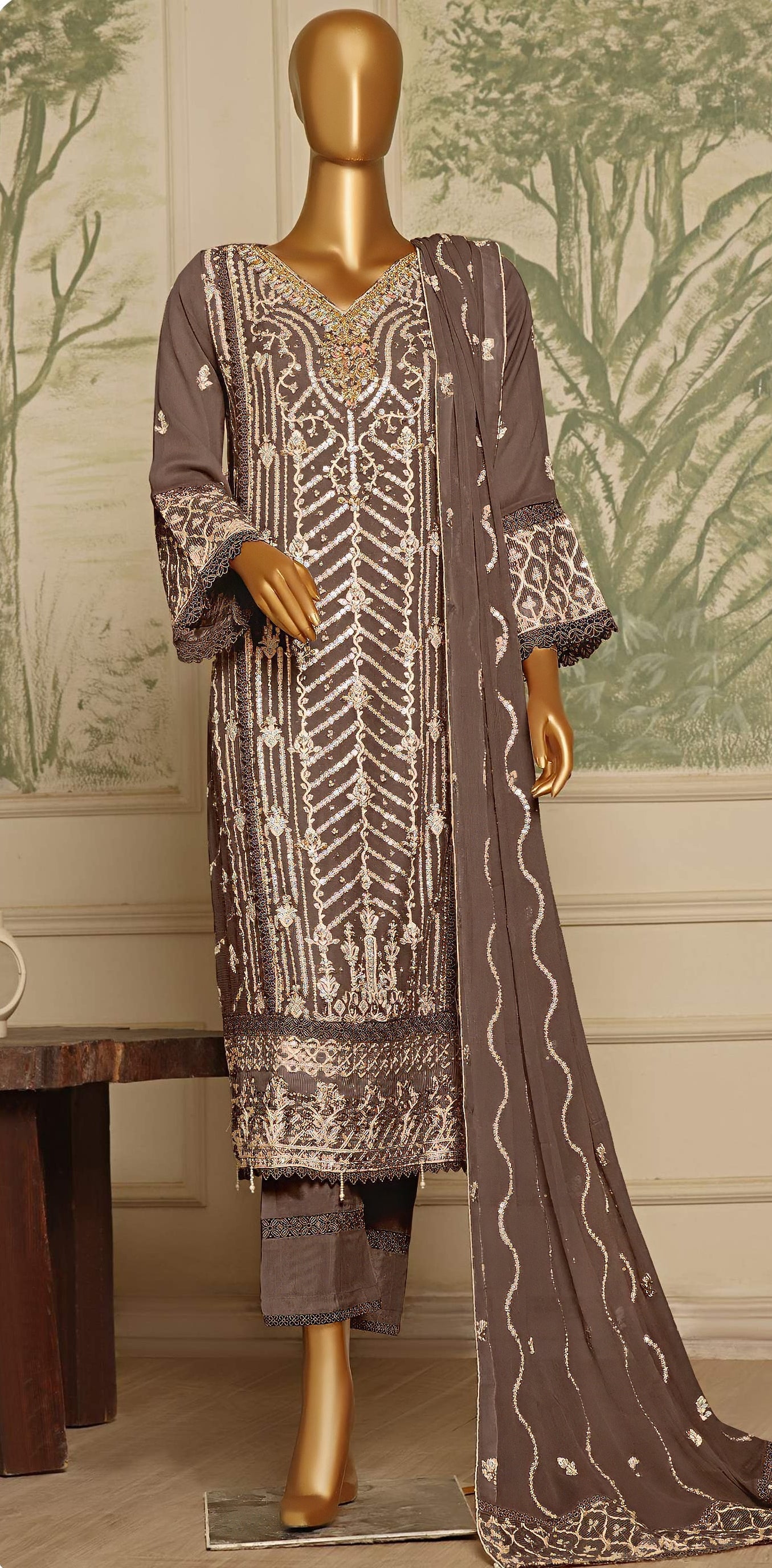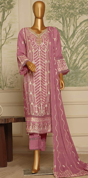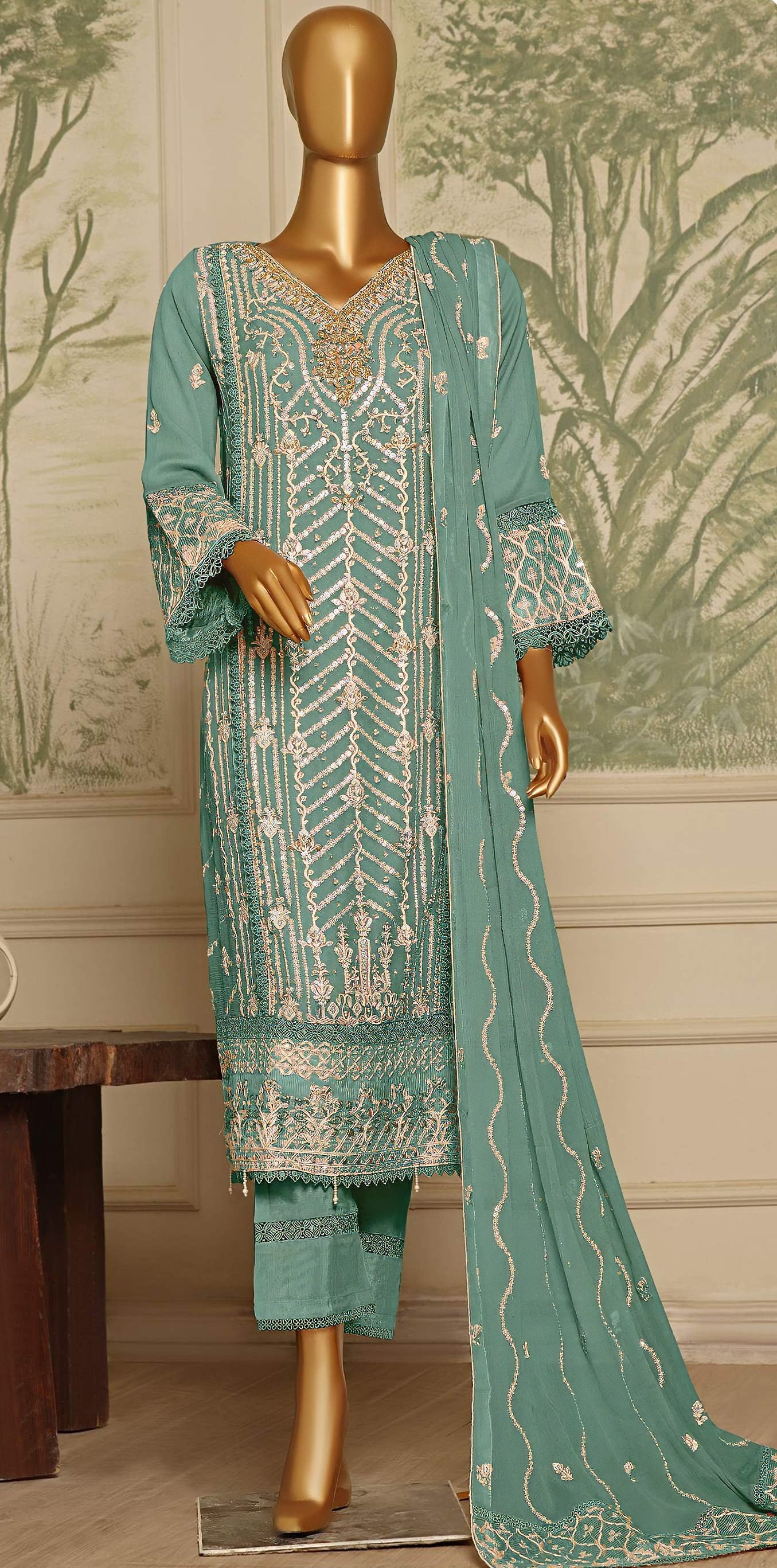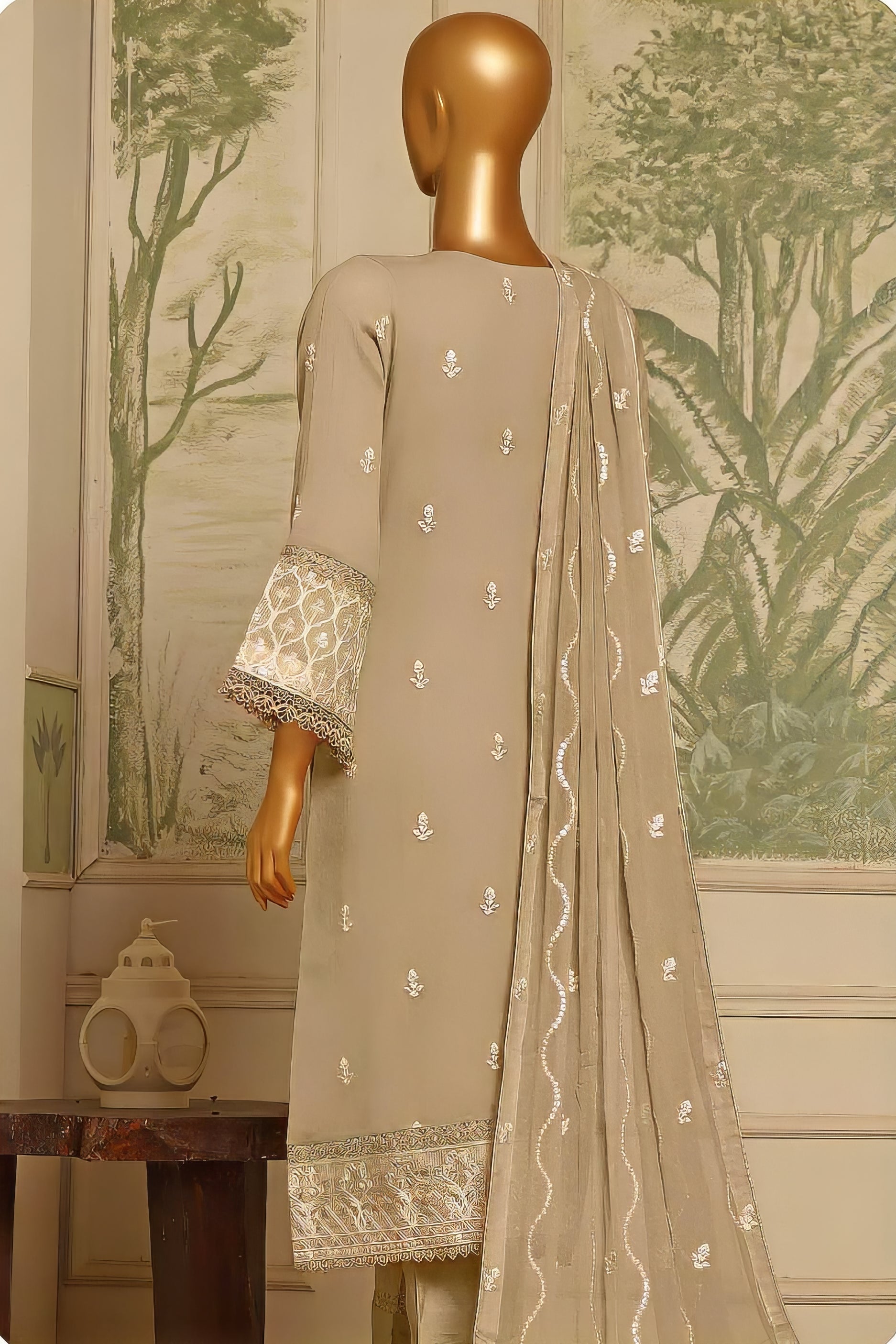 This elegant readymade outfit is beautifully designed in heavy georgette fabric, adorned with delicate embroidery on both the top and sleeves. The set is paired with a comfortable dull santoon bottom and a matching embroidered georgette dupatta, creating a perfect combination of style and comfort for festive occasions.