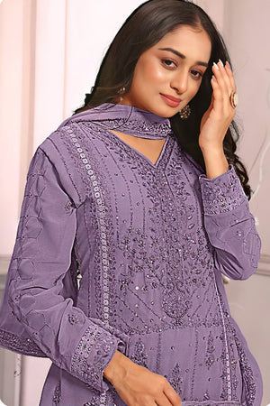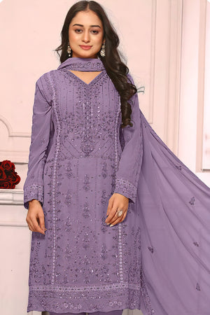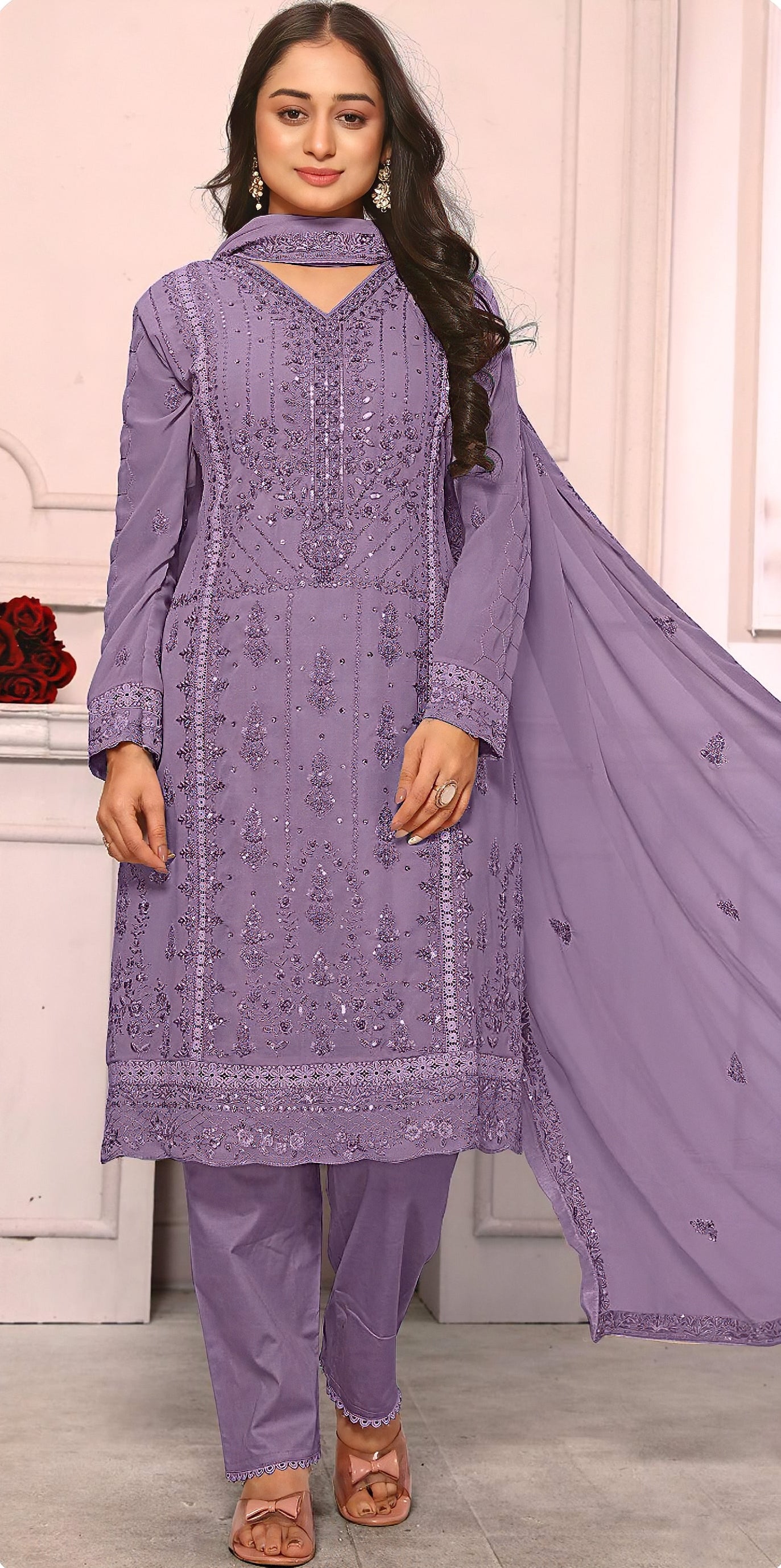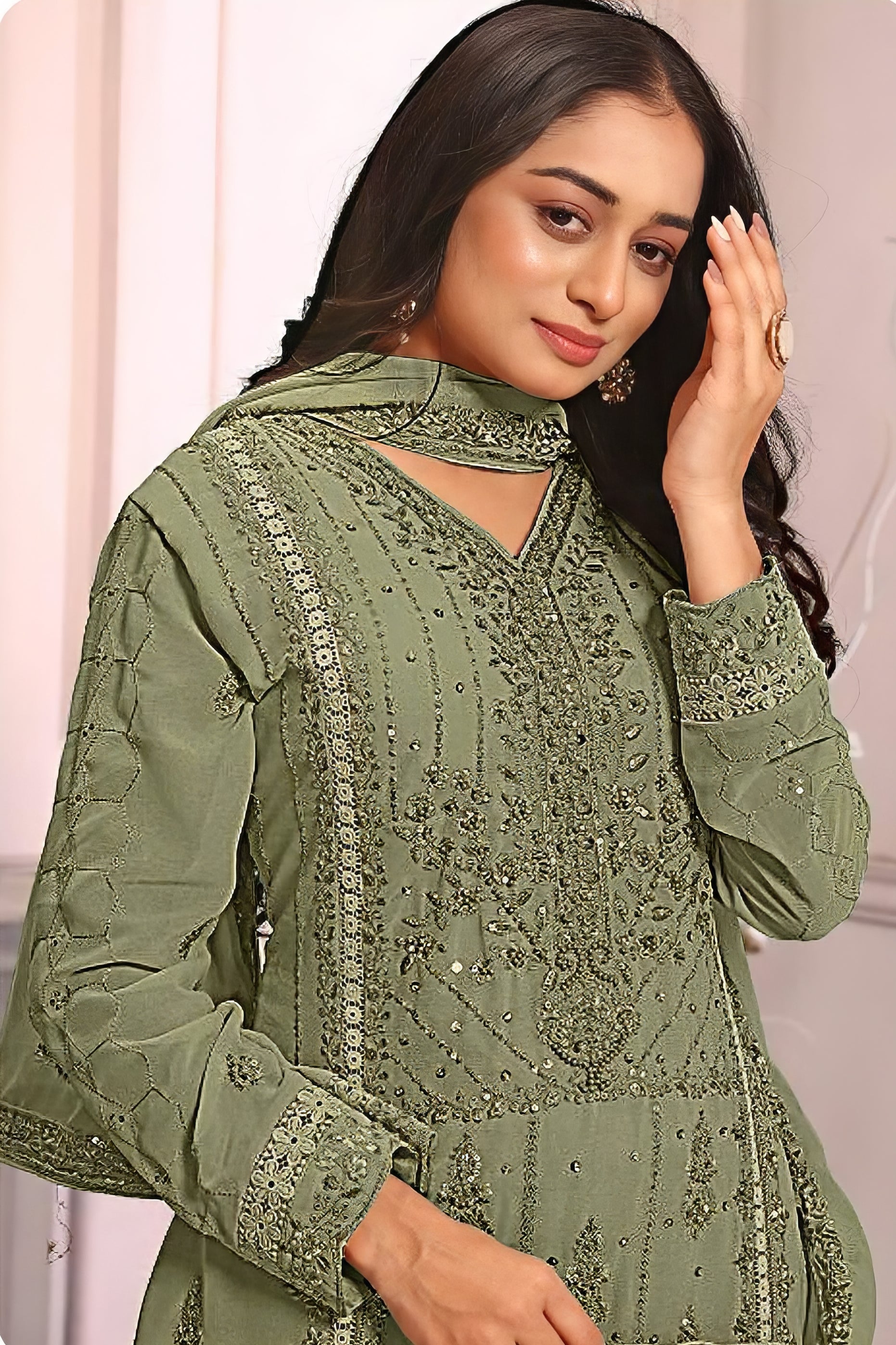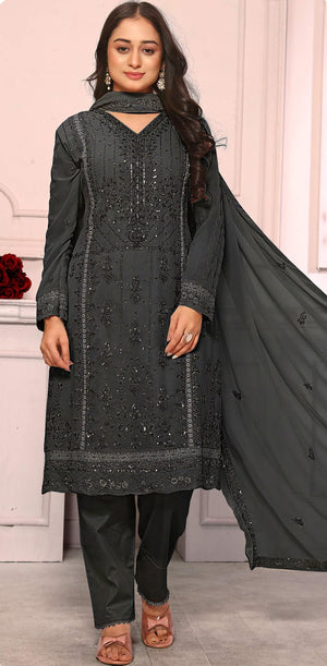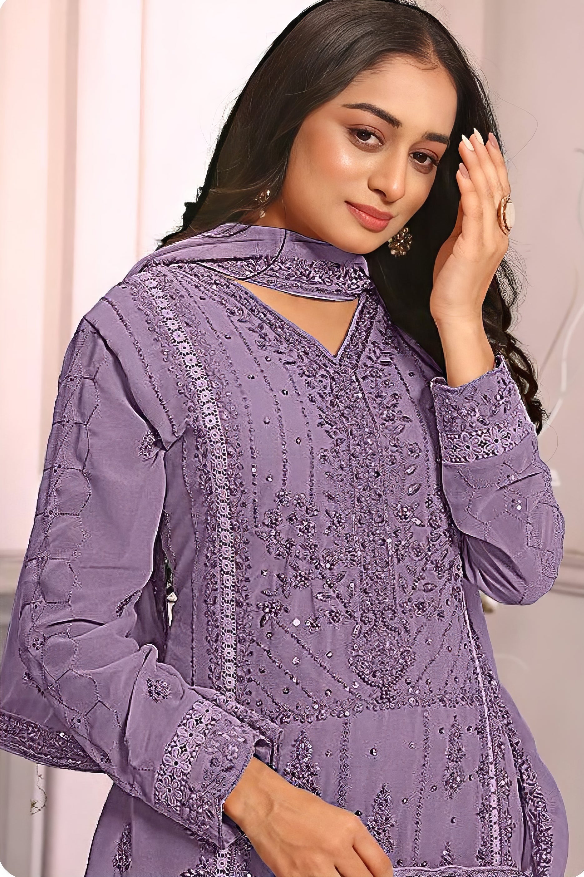A luxurious readymade ensemble designed in premium georgette fabric. The top features elegant embroidery and latkan details, while the back and sleeves showcase fine craftsmanship on soft georgette. The bottom is made of premium gorgate with a dull santoon inner for added comfort. The matching embroidered dupatta completes this graceful and festive look.
