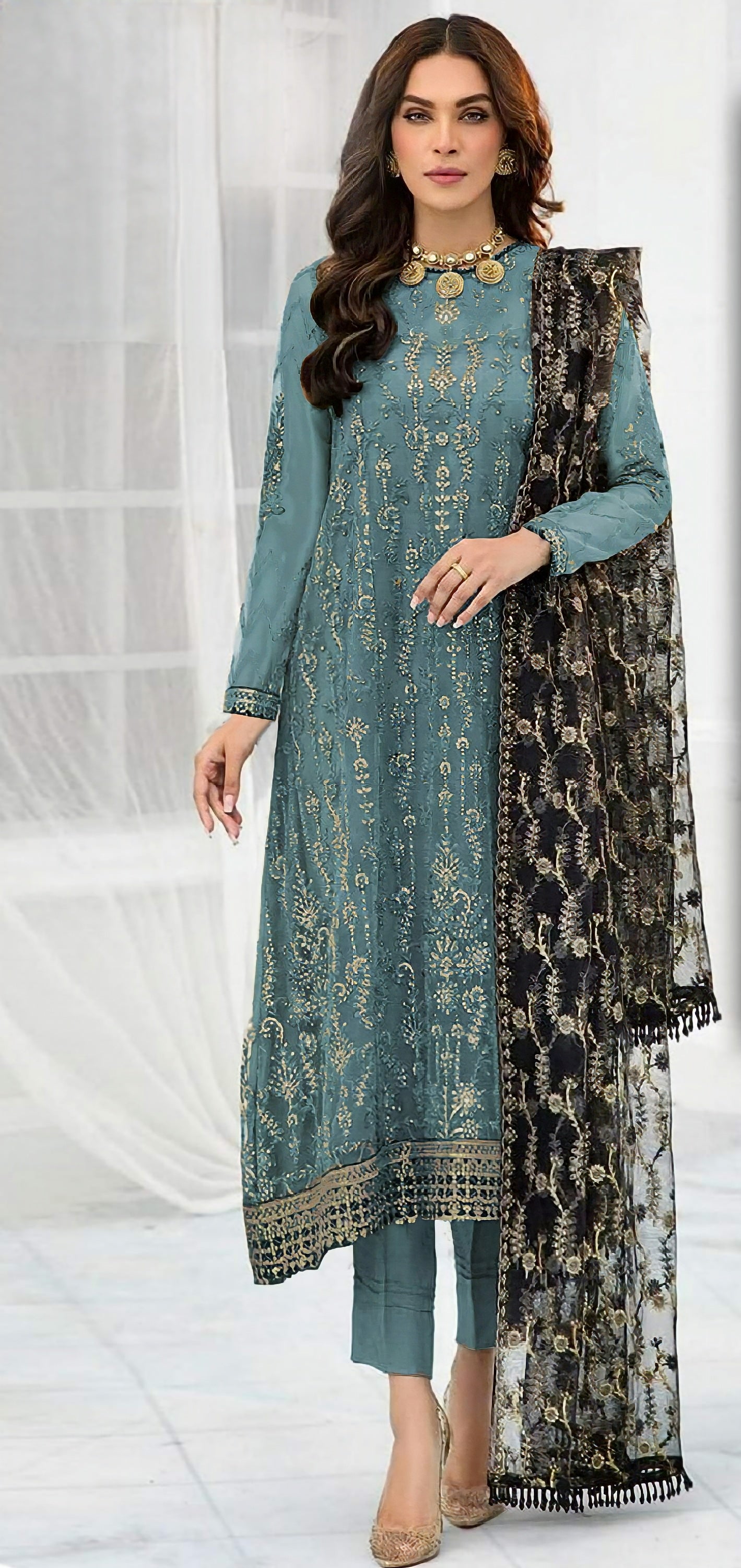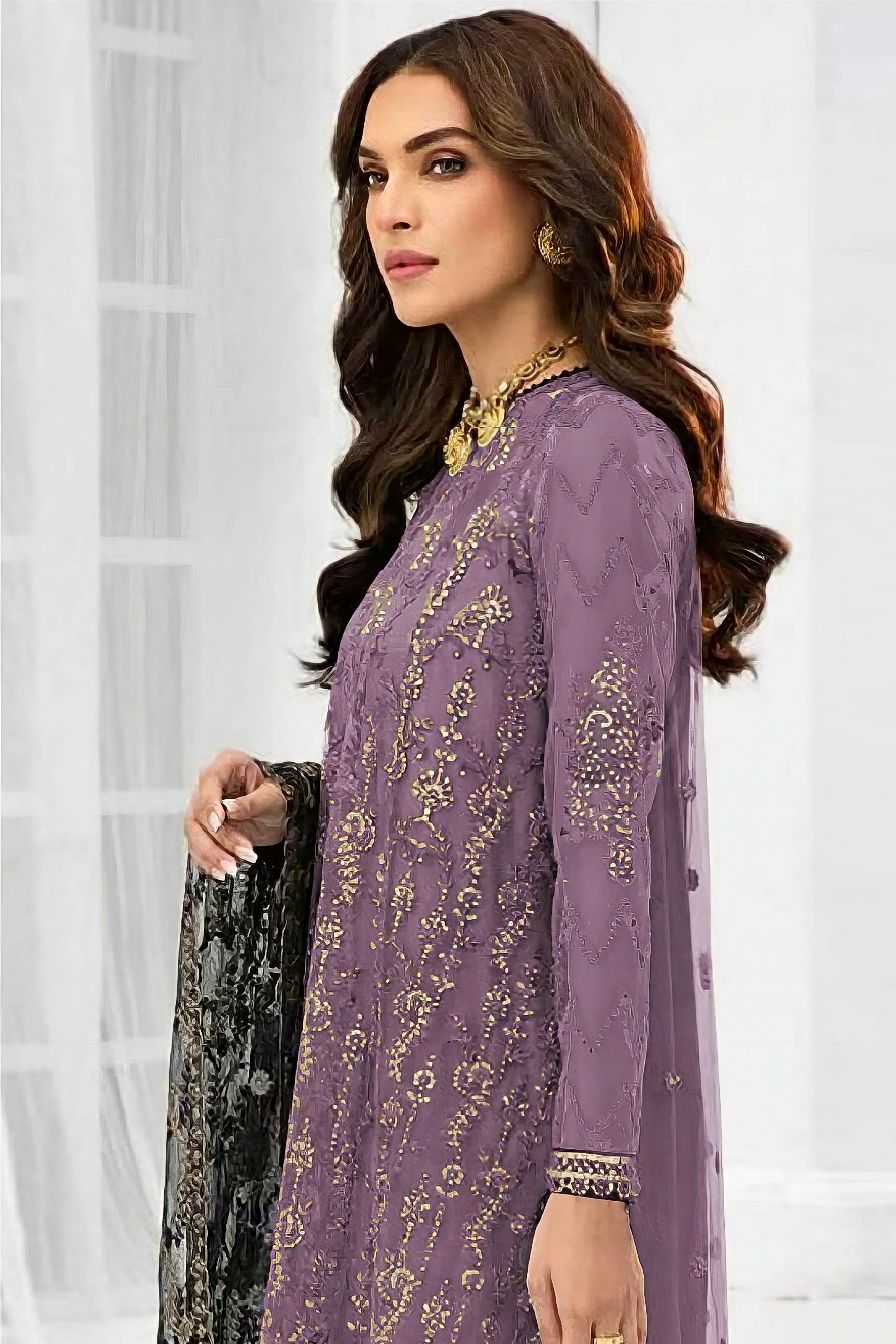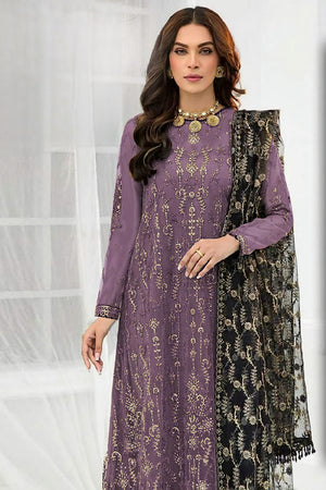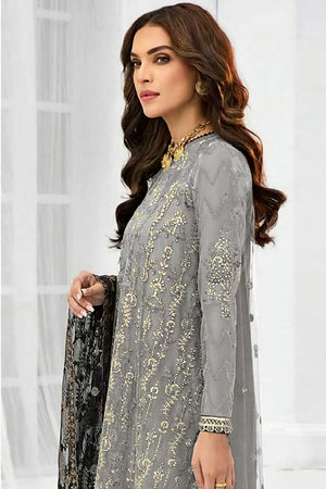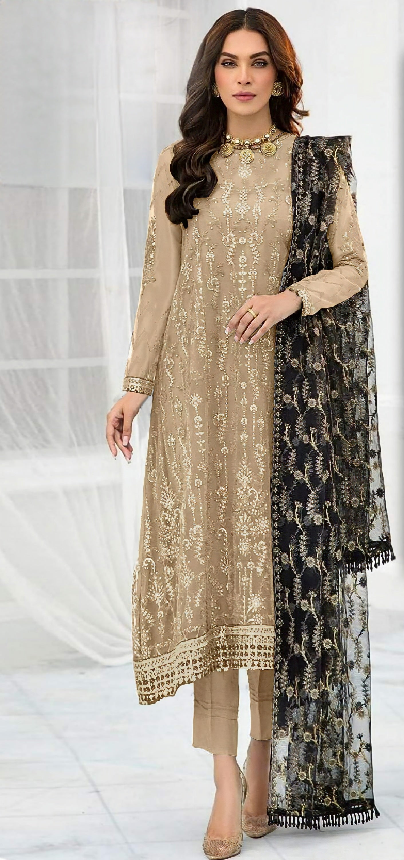 An elegant readymade set designed on rich georgette fabric featuring delicate embroidery and sequin embellishments. The ensemble includes beautifully detailed sleeves and ghera lace, complemented by an embroidered dupatta. The dull santoon trouser enhanced with embroidered lace completes the refined and graceful look, ideal for festive and traditional wear.