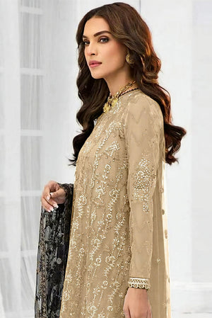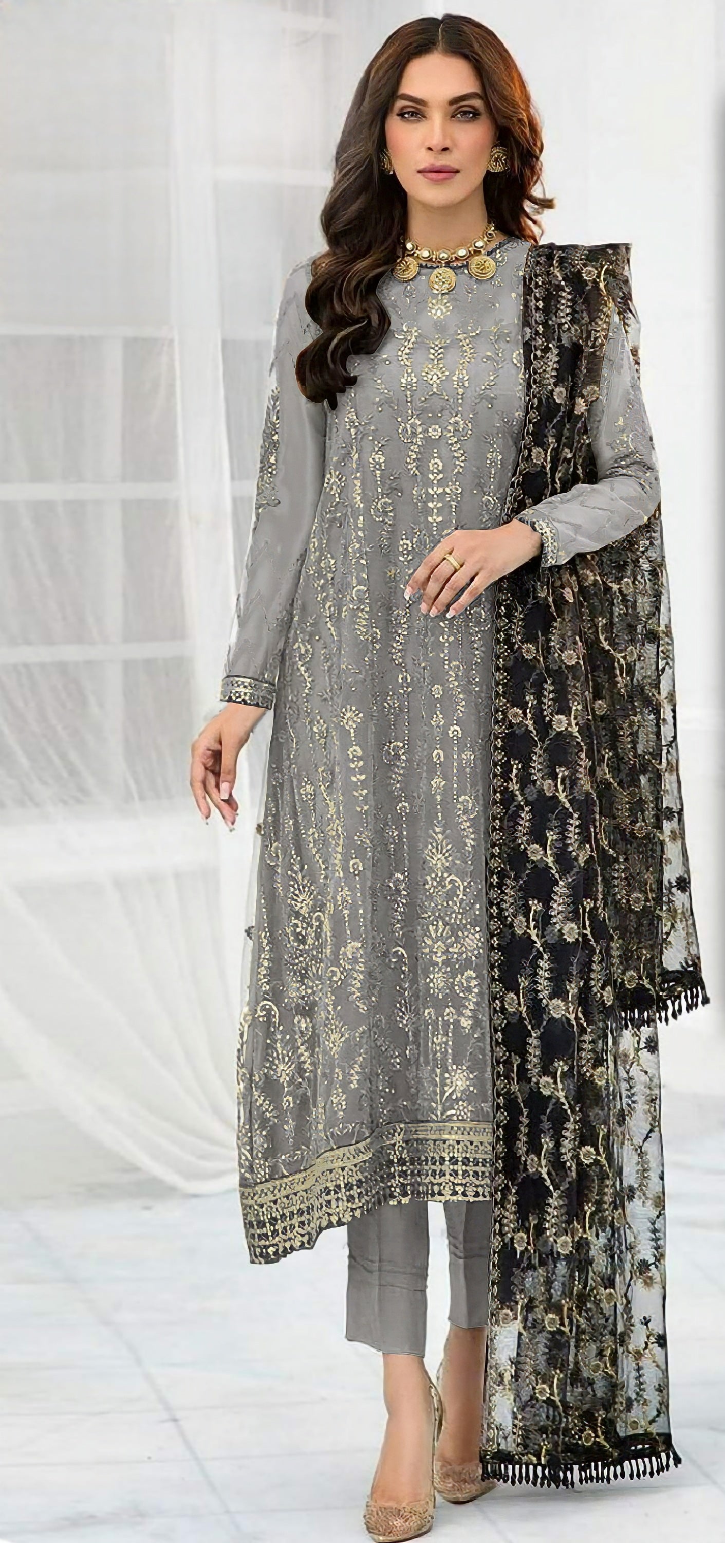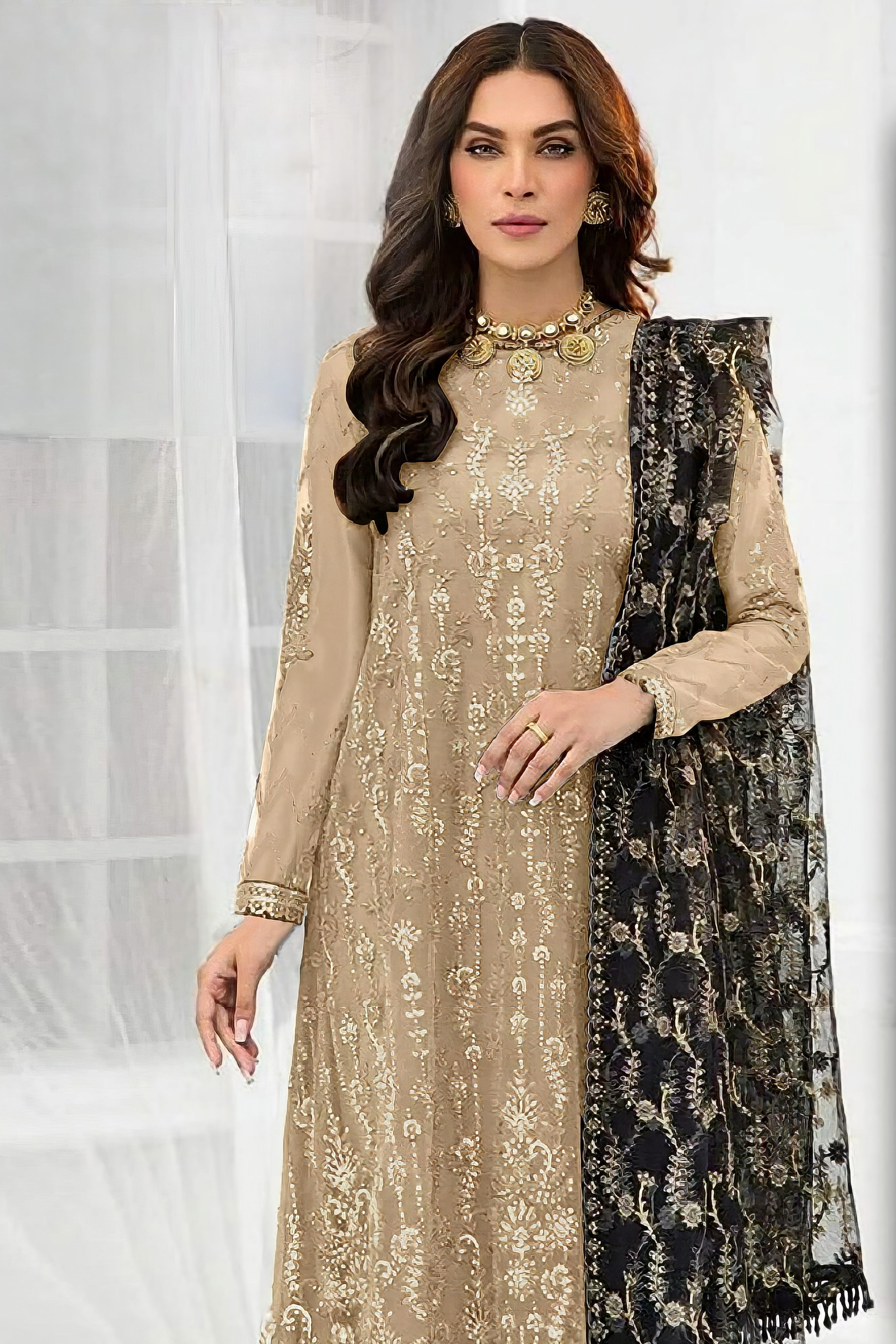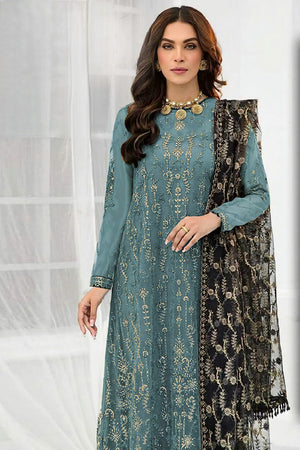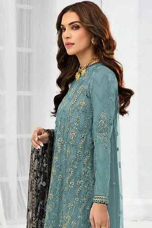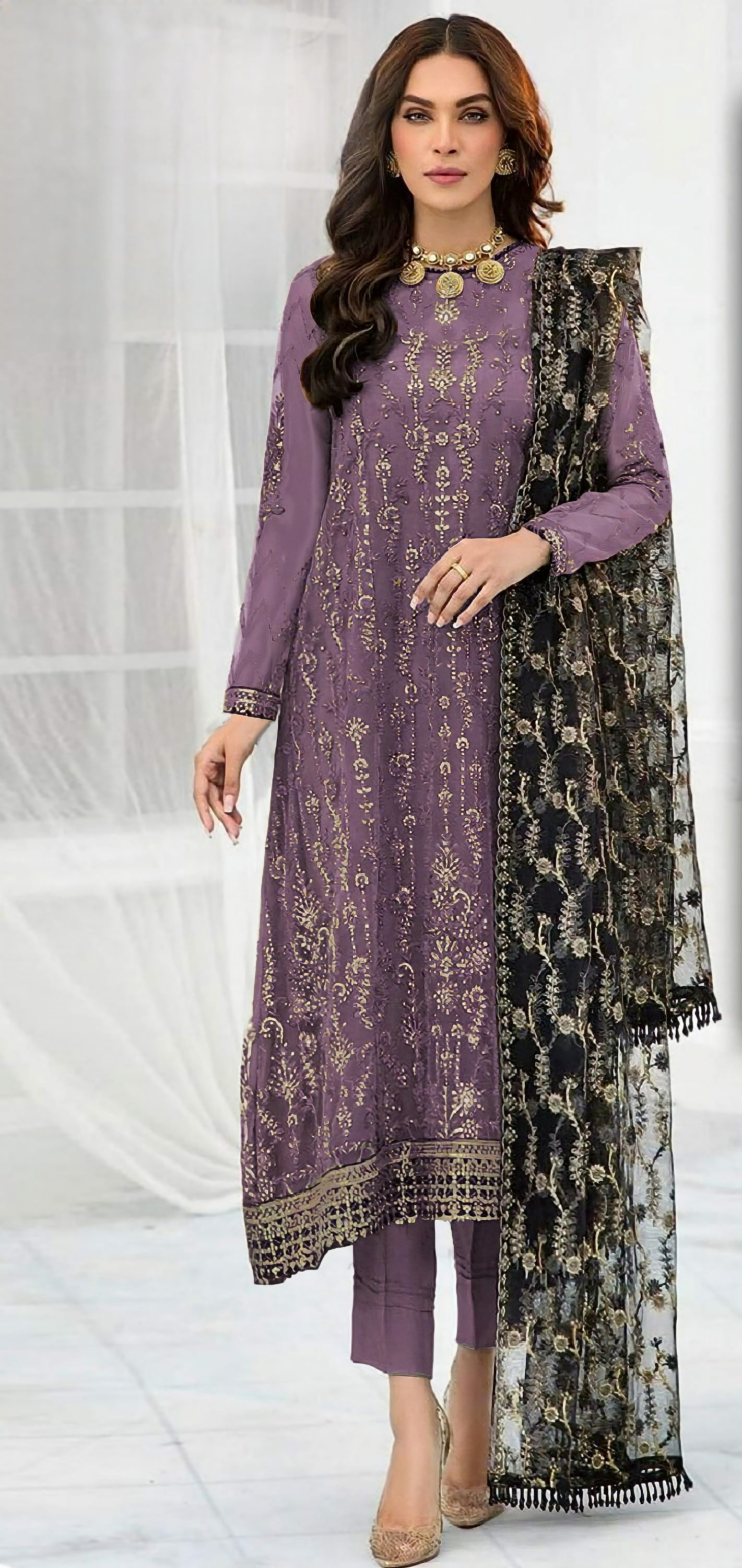 An elegant readymade set designed on rich georgette fabric featuring delicate embroidery and sequin embellishments. The ensemble includes beautifully detailed sleeves and ghera lace, complemented by an embroidered dupatta. The dull santoon trouser enhanced with embroidered lace completes the refined and graceful look, ideal for festive and traditional wear.
