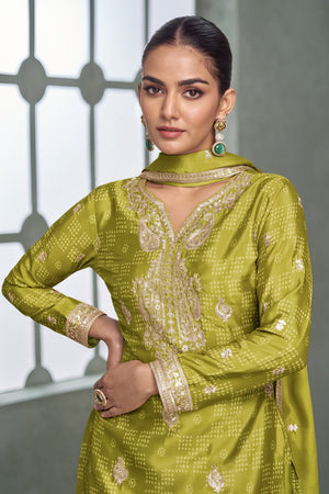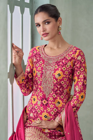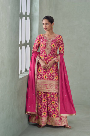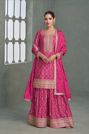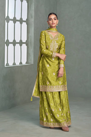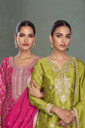 This designer sharara set is tailored from luxurious premium chinnon silk, offering a smooth texture and rich sheen. The top, crafted in fine chinnon silk, exudes timeless elegance, while the flowing sharara bottom adds volume and a statement appeal. Completing the ensemble is a matching chinnon silk dupatta that enhances the outfit’s refined charm. Designed with finesse, this sharara set is the perfect blend of sophistication and tradition, making it an ideal choice for grand occasions.