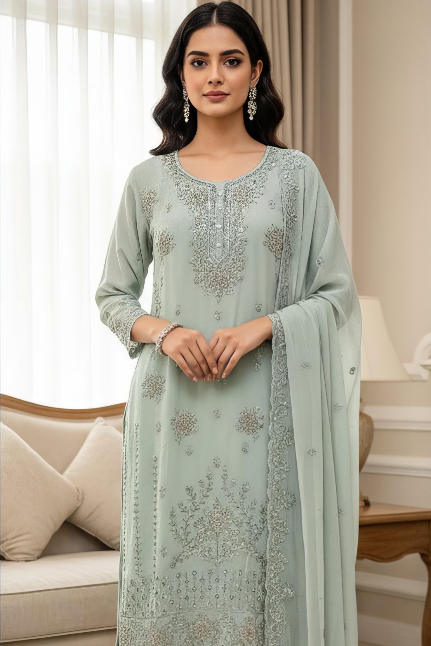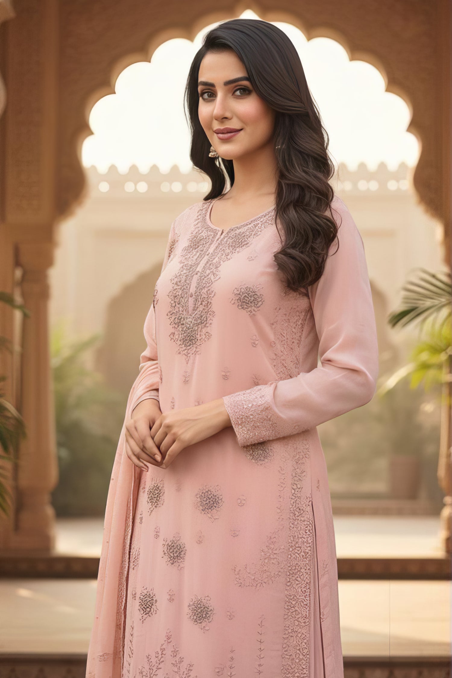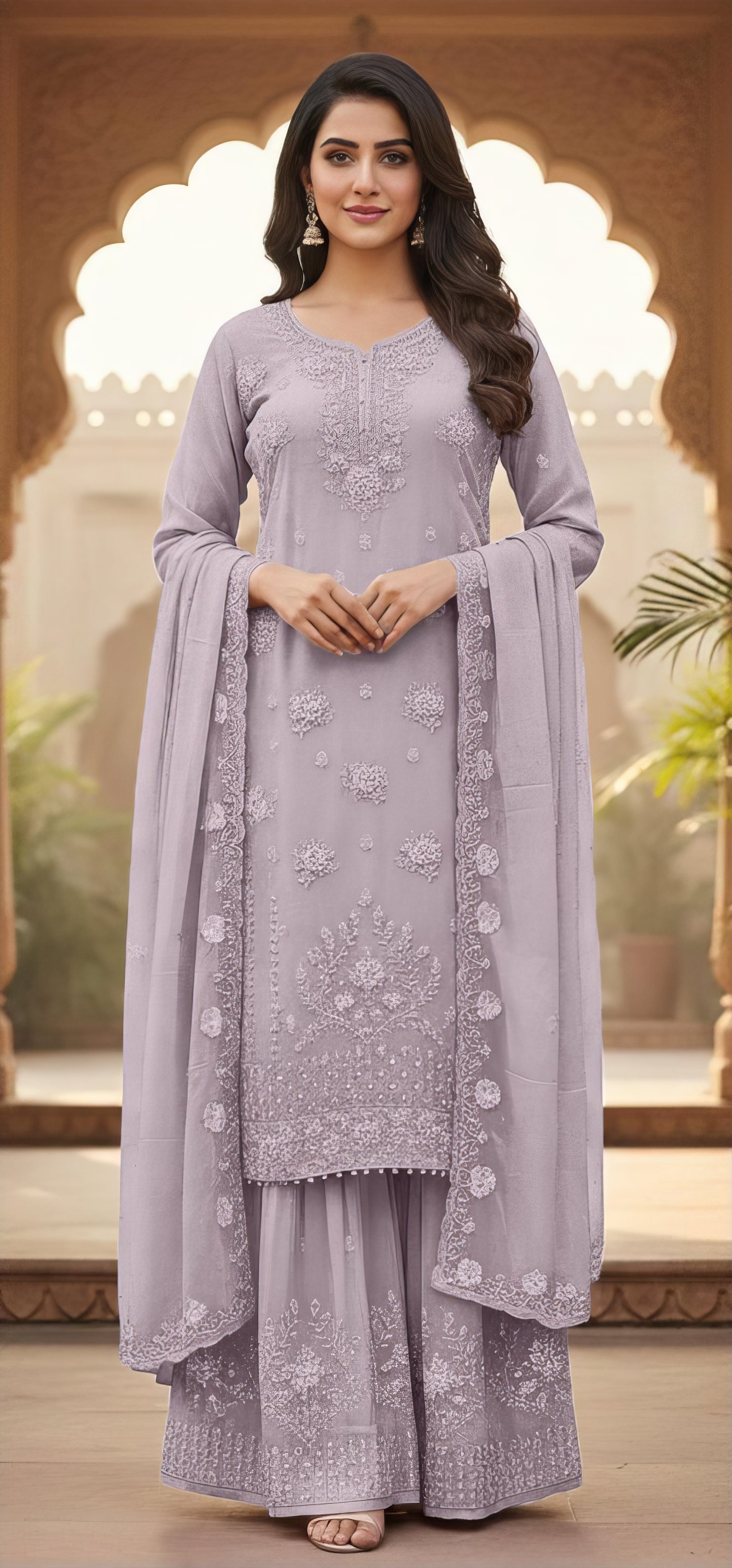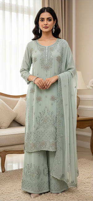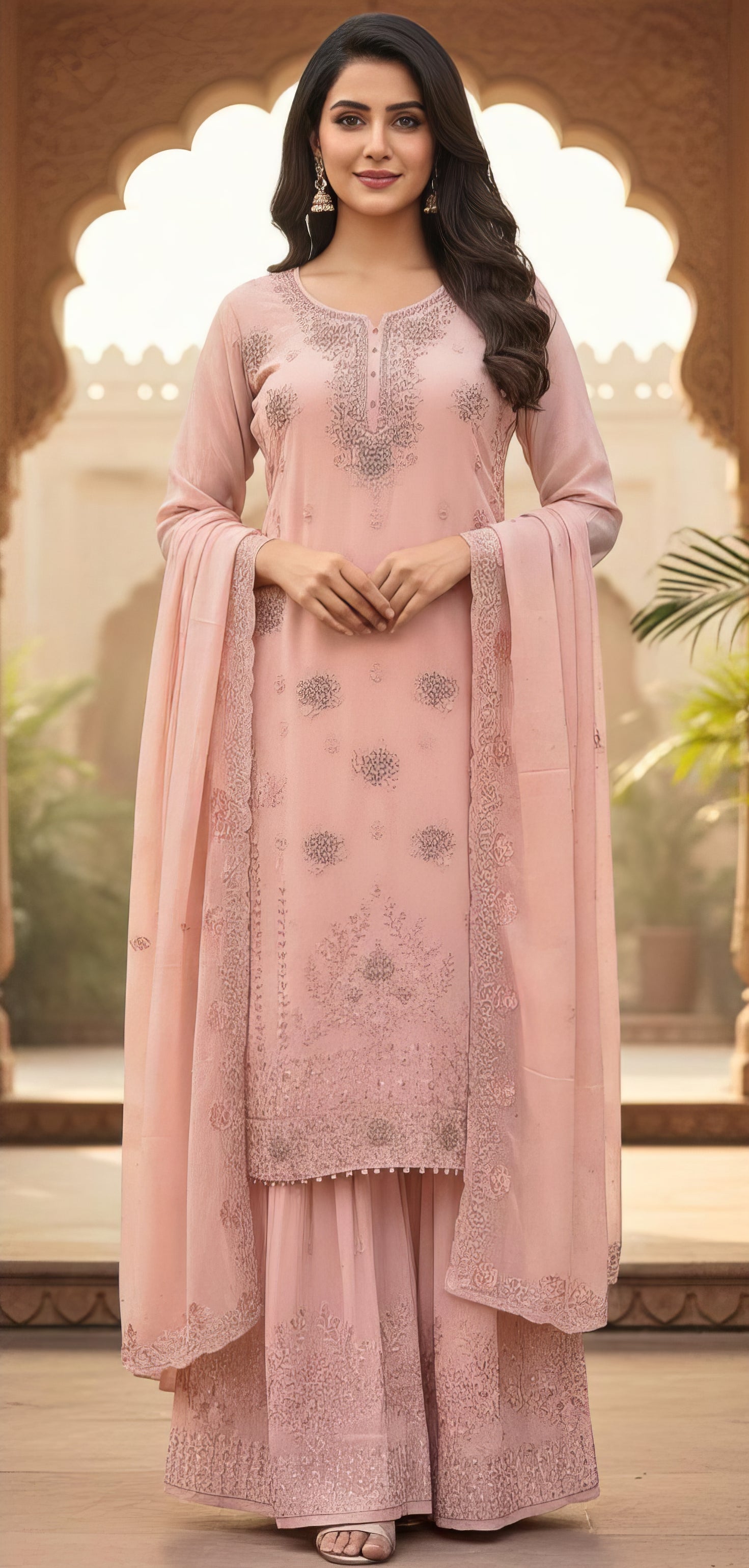 Elevate your ethnic wardrobe with this elegant Heavy Georgette suit set, beautifully designed with intricate Zarkan embroidery work. Crafted for both comfort and style, this outfit features a flowy plazo bottom and a matching dupatta, making it an ideal choice for festive occasions, parties, and celebrations.