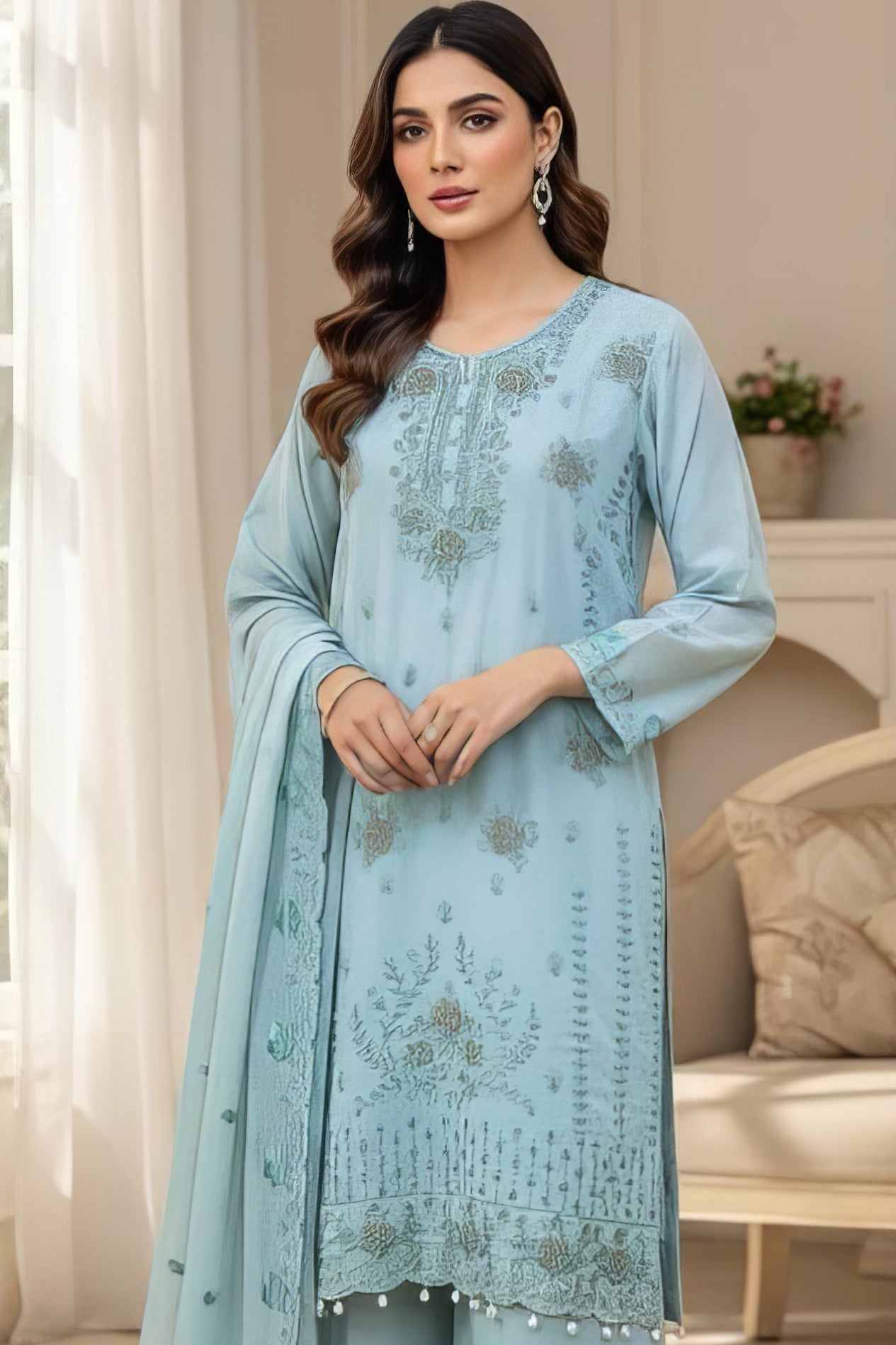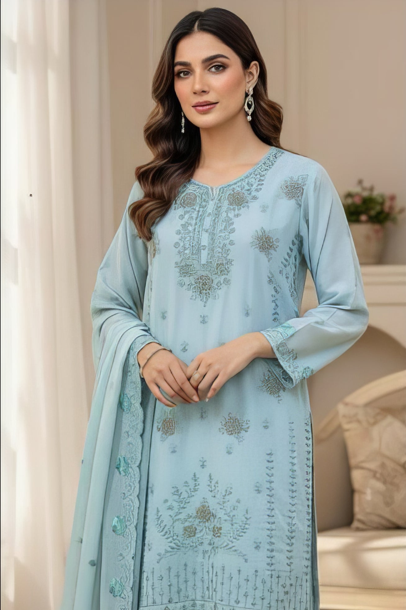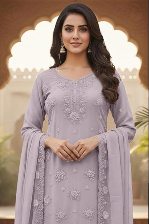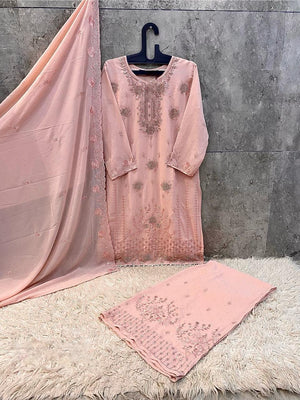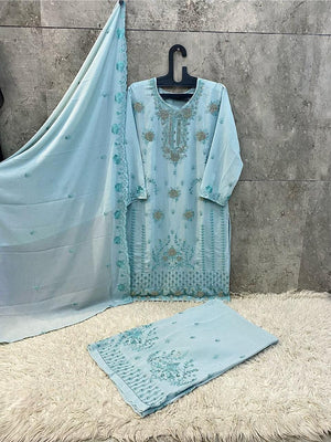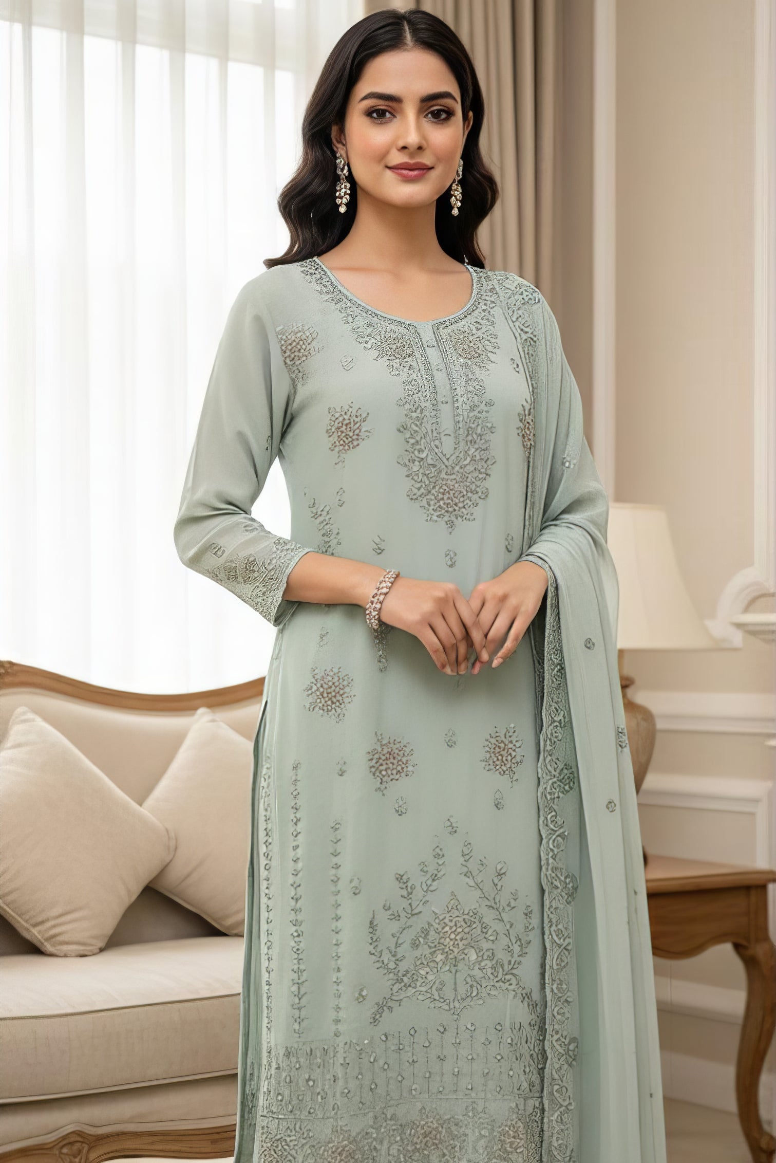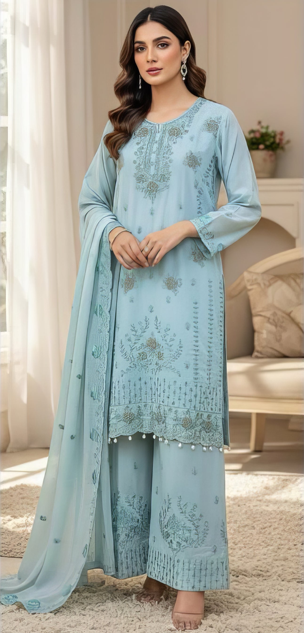 Elevate your ethnic wardrobe with this elegant Heavy Georgette suit set, beautifully designed with intricate Zarkan embroidery work. Crafted for both comfort and style, this outfit features a flowy plazo bottom and a matching dupatta, making it an ideal choice for festive occasions, parties, and celebrations.
