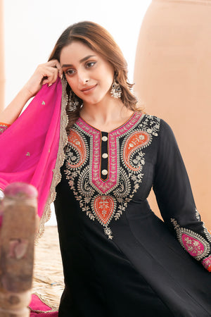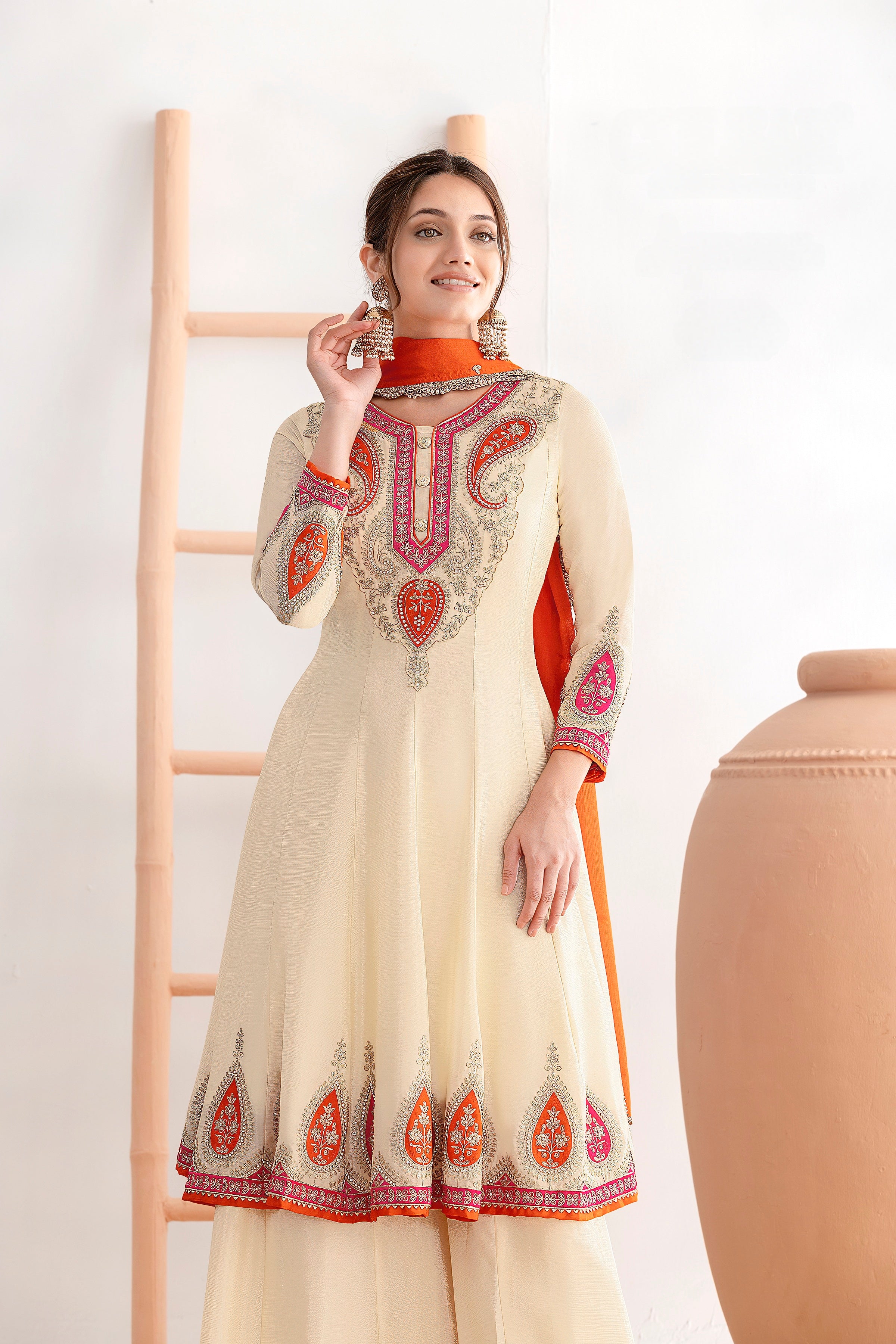 Make a graceful statement with this exquisitely crafted Kalidar Anarkali Set, designed to reflect timeless elegance and luxury craftsmanship. Tailored in premium chinnon fabric, this ensemble is perfect for festive occasions, weddings, and special celebrations.
