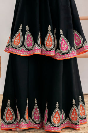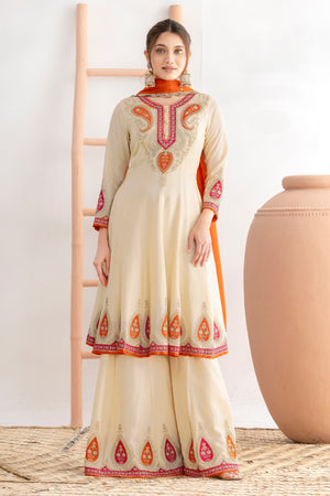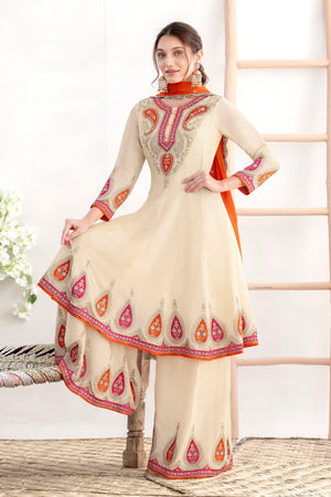 The Kalidar Anarkali top features intricate applique-style embroidery enhanced with dabka zari and Swarovski work, creating a rich and sophisticated look. Paired with a beautifully flared kalidar palazzo, the outfit offers comfort along with regal appeal. Completing the set is a premium chinnon dupatta adorned with four-side handmade moti lace, adding a refined finishing touch.