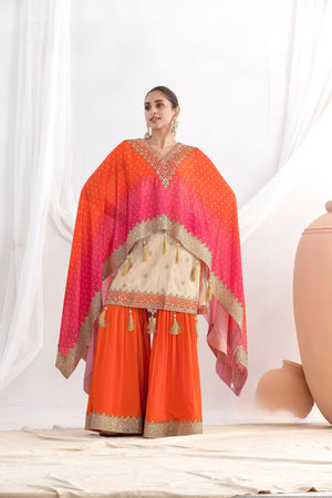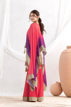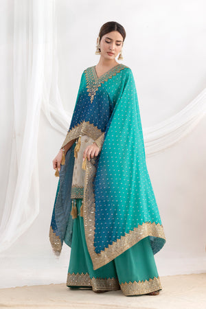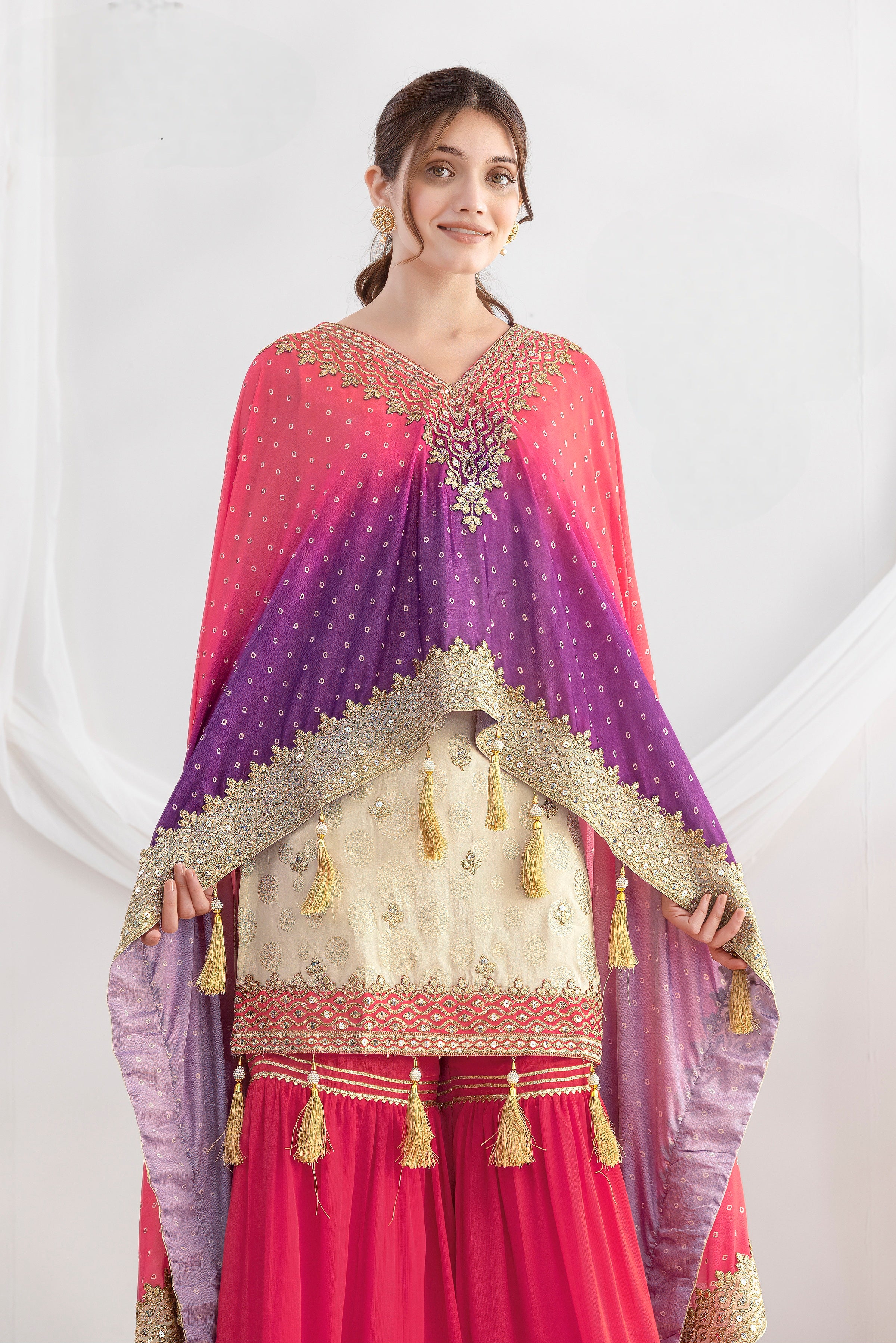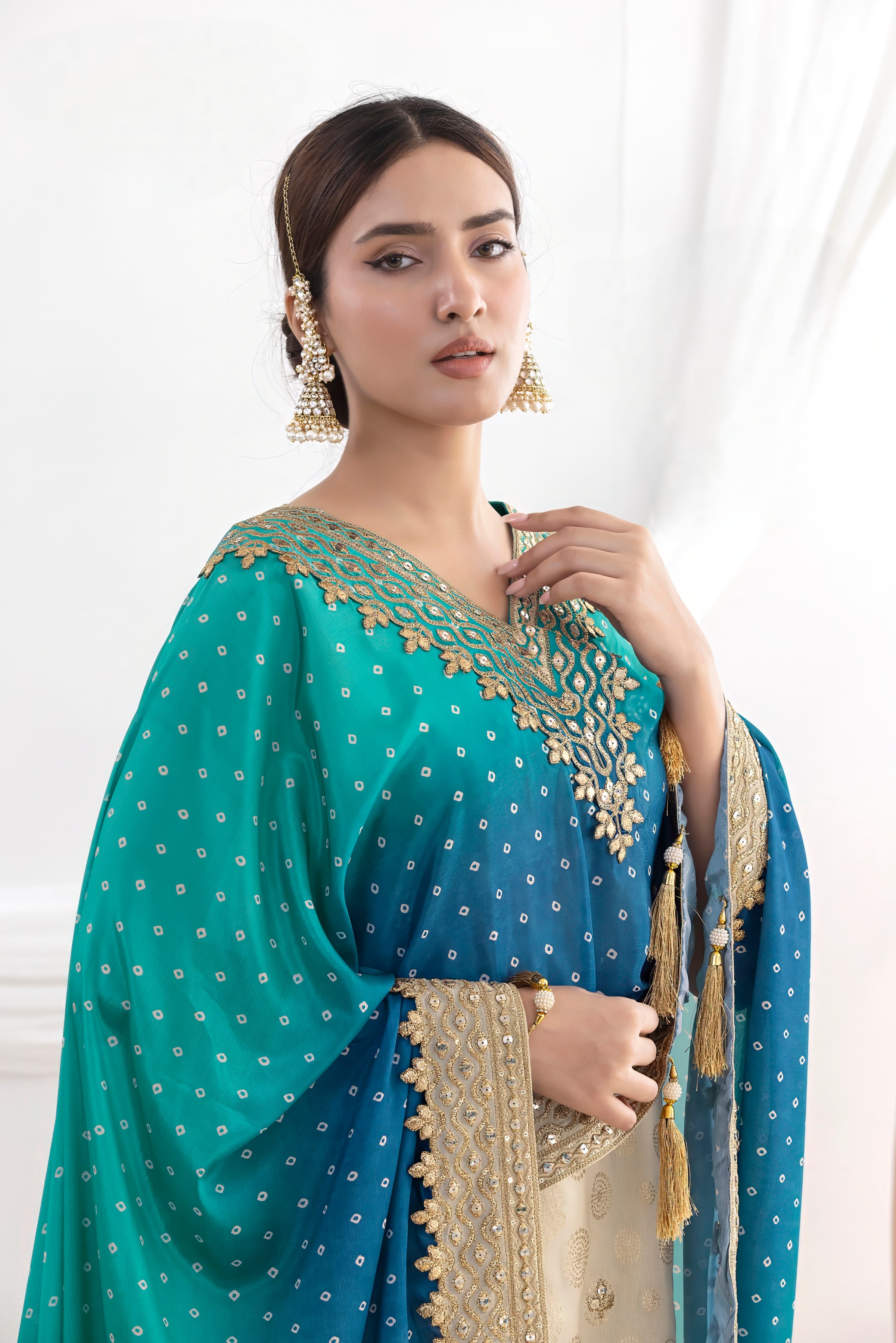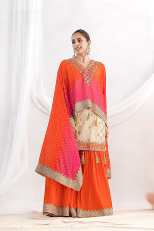 Step into timeless elegance with this exquisitely crafted sharara set, designed to make a statement at festive and celebratory occasions. A perfect blend of traditional craftsmanship and contemporary style, this ensemble reflects luxury in every detail.