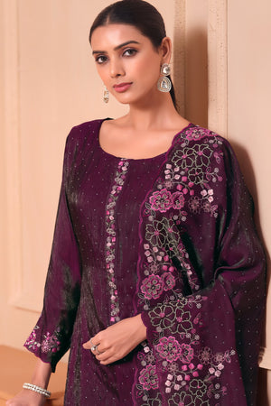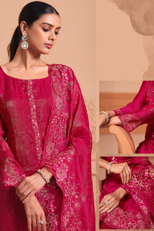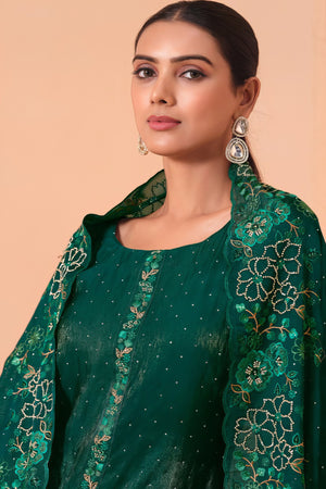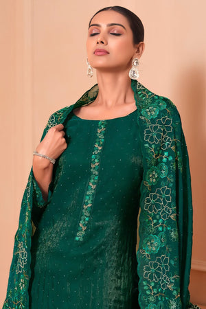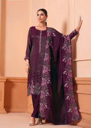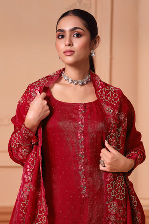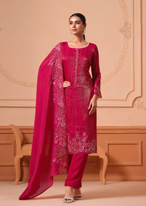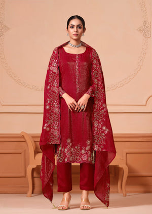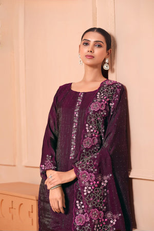 This luxurious ensemble is crafted with a Martini Gold top adorned with intricate embroidery and sparkling Jarkan work, giving it a rich and festive appeal. The Pure Viscose Santoon bottom ensures comfort while maintaining elegance. The matching Martini Gold dupatta with heavy embroidery and Jarkan detailing completes the look with grandeur.