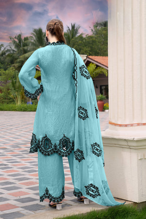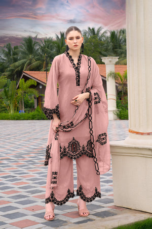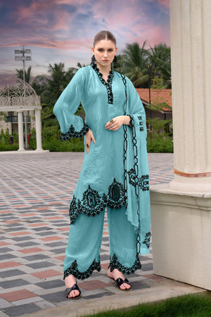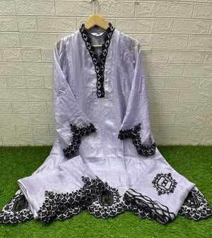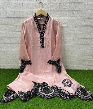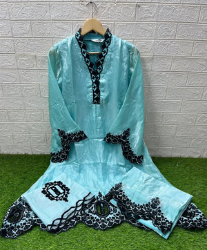 This designer frock-style tunic features classic embroidery with elegant cutwork on both the front and back. The set includes glamorous embroidered sleeves and matching Fandy Silk plazzo for a comfortable yet stylish look. The ensemble is completed with a simmer chiffon dupatta detailed with embroidery and cutwork, creating a graceful and sophisticated outfit perfect for festive and special occasions.
