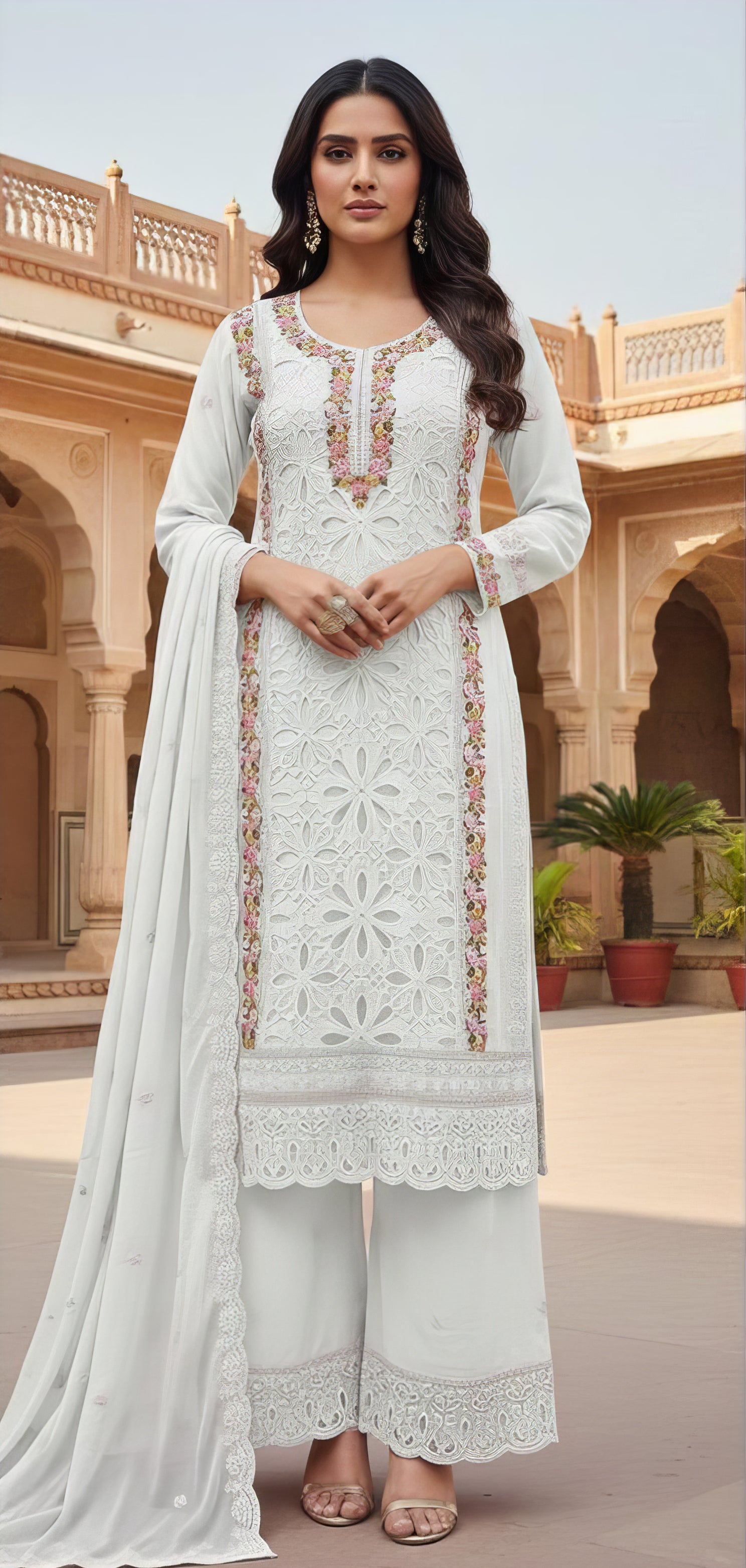 This elegant suit set is crafted from heavy georgette and features intricate zarkan work on the top for a luxurious festive look. It comes with a matching heavy georgette plazo bottom and a coordinating dupatta, making it perfect for weddings, parties, and special occasions.