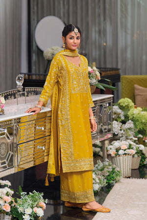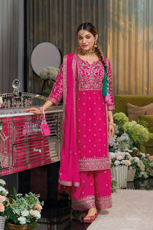 Crafted in luxurious premium Chinon silk, this elegant set features a coordinated top and plazzo that offer both comfort and sophistication. The matching dupatta in the same fabric adds fluidity and charm, making it a versatile pick for festive and semi-formal occasions.