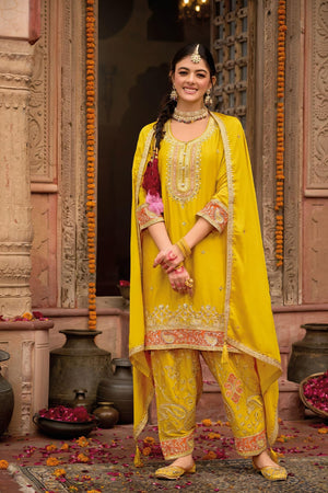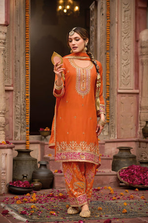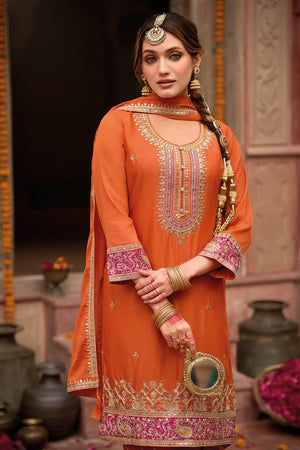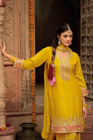 Crafted in luxurious premium Chinon silk, this elegant set features a coordinated top and plazzo that offer both comfort and sophistication. The matching dupatta in the same fabric adds fluidity and charm, making it a versatile pick for festive and semi-formal occasions.