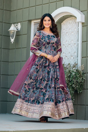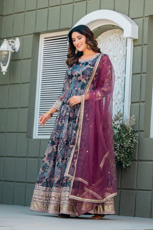 This elegant gown is crafted from premium Tabby Silk, beautifully adorned with embroidery thread and sequins work. It comes with a full American lining for comfort, a free-size fit up to XXL (44'') with extra margin, 58-inch length, and a 3.5-meter flair. The set is paired with a 2.4-meter net dupatta embellished with diamond work, completing the graceful ensemble.