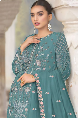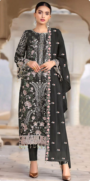 This stunning readymade ensemble is crafted from premium heavy georgette, beautifully detailed with full Zarkan and Latkan work. The embroidered sleeves enhance its charm, while the dull santoon bottom ensures comfort. Completing the look is a heavy georgette dupatta with intricate lacework and Latkan accents for a graceful finish.