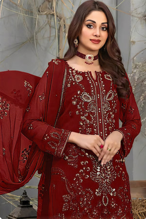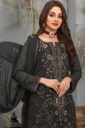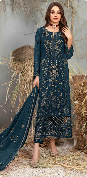 This stunning readymade ensemble is crafted from premium heavy georgette, beautifully detailed with full Zarkan and Latkan work. The embroidered sleeves enhance its charm, while the dull santoon bottom ensures comfort. Completing the look is a heavy georgette dupatta with intricate lacework and Latkan accents for a graceful finish.
