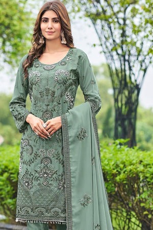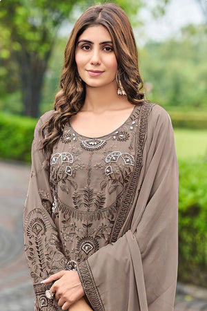 This exquisite readymade outfit is crafted from premium heavy georgette fabric, featuring elegant embroidery and shimmering Jarkan work on the top and sleeves. The embroidered georgette dupatta adds a touch of sophistication, making it perfect for festive occasions and celebrations.