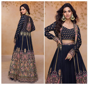 This gown set is crafted from premium georgette, offering a lightweight and flowy drape with a graceful finish. The top is tailored in elegant georgette for a refined silhouette, paired with a matching bottom for a complete and coordinated look. The soft texture and fluidity of georgette make this gown a timeless choice for special occasions.