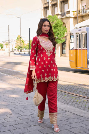 This exquisite ensemble is crafted from premium Simar Silk, featuring a heavily embroidered top enhanced with intricate hand-embellished mirror work. The embroidered plazzo pant in Simar Silk adds modern elegance while maintaining traditional charm. Completing the outfit is a richly embroidered silk or organza dupatta, making this attire a perfect choice for grand occasions.